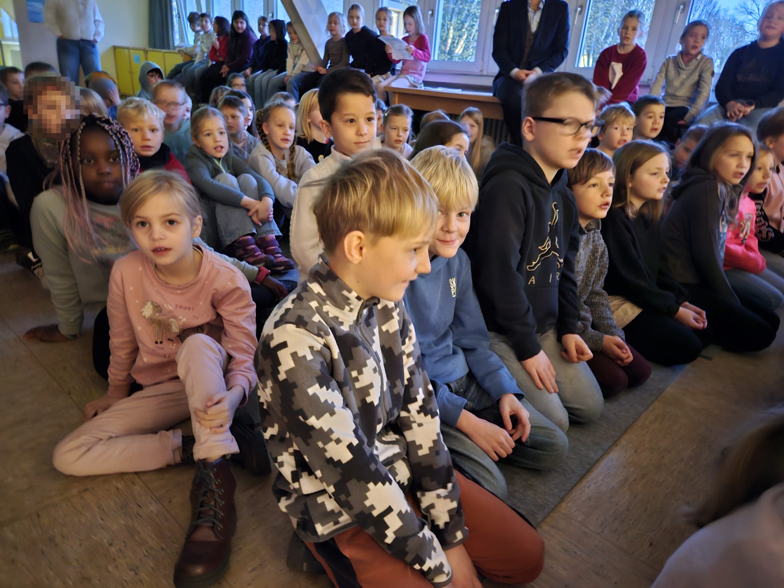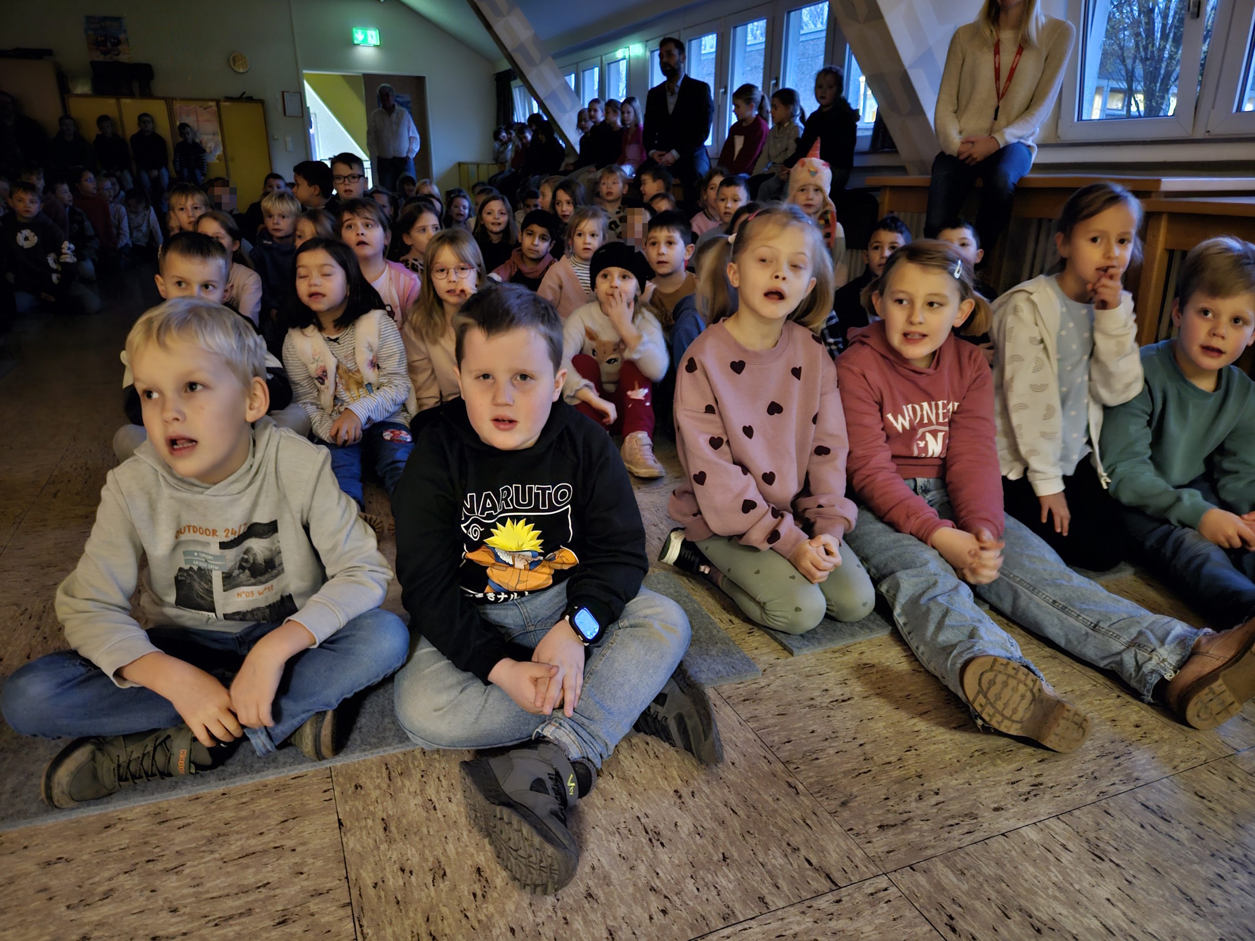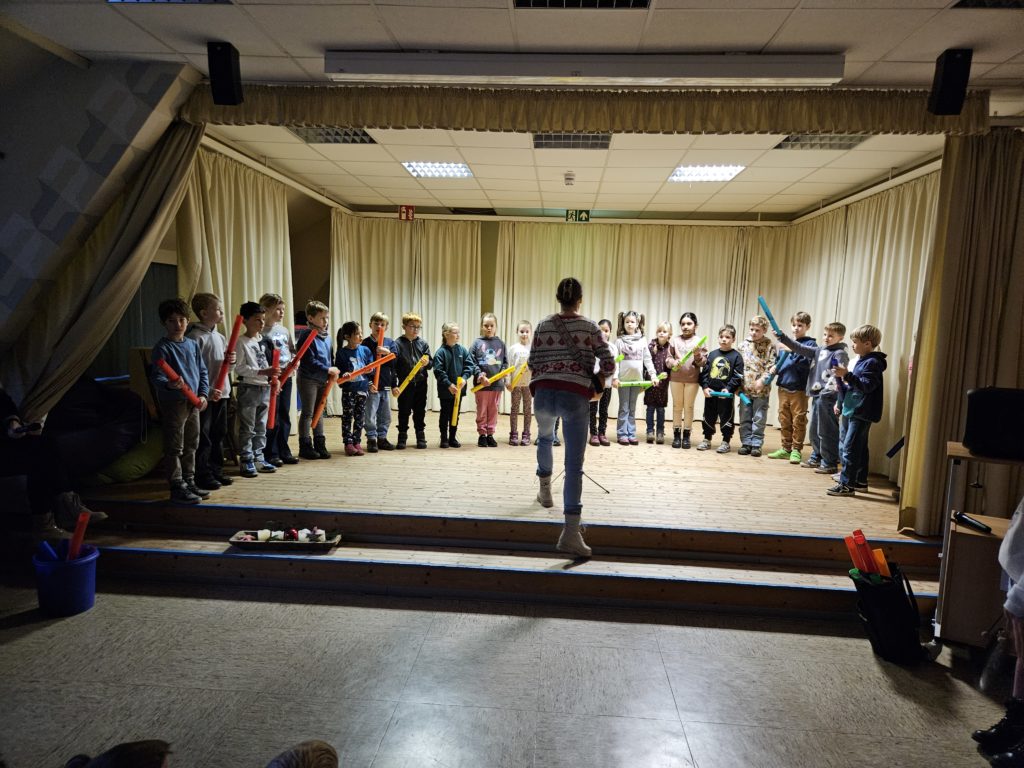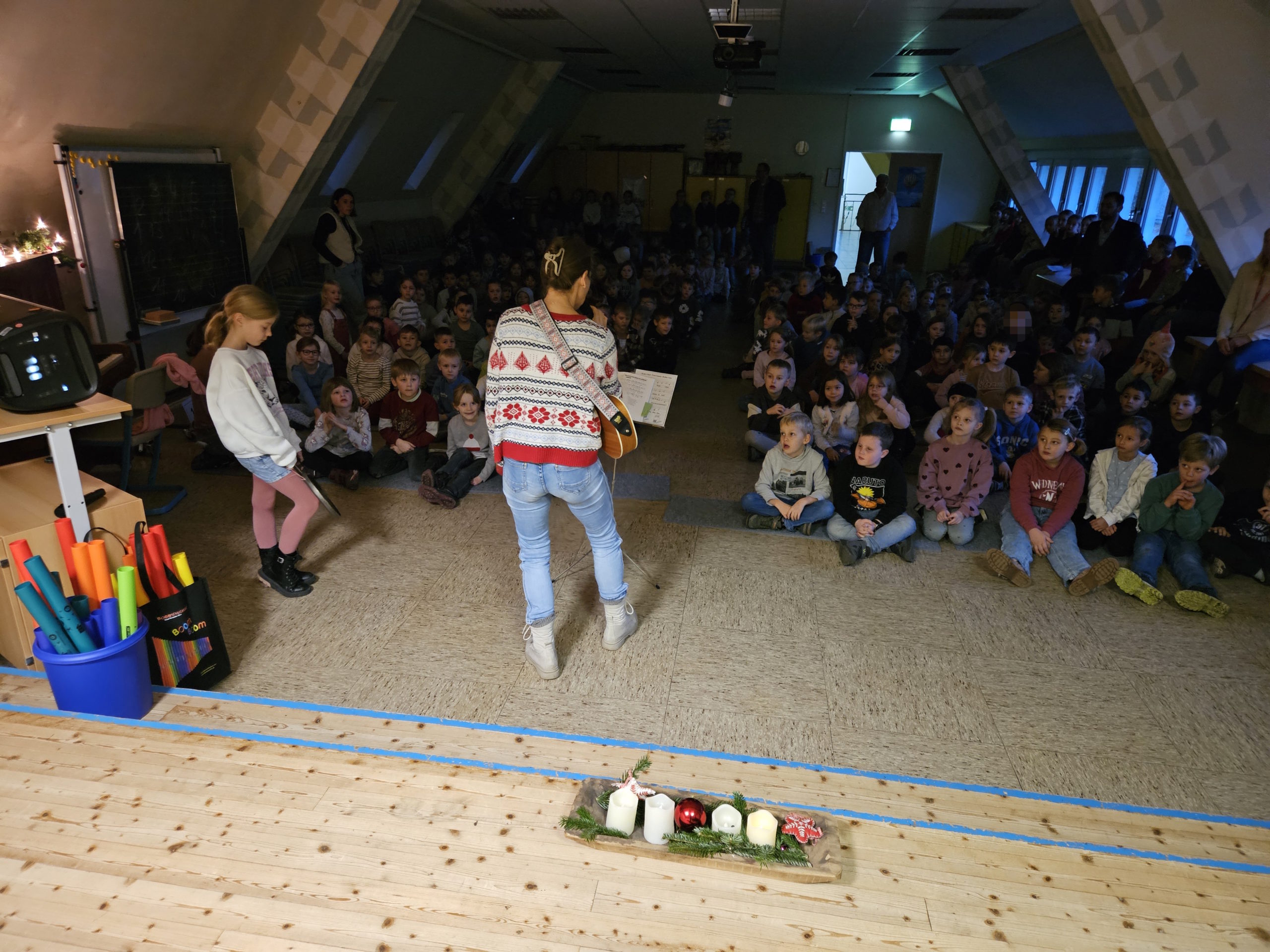 In der diesjährigen Adventszeit findet an unserer Schule wieder das wöchentliche Adventssingen statt. Dazu versammelten sich alle Kinder und ihre Lehrkräfte am Dienstag, den 02.12.25 zu Beginn der ersten Stunde in der Aula. Nachdem die erste Kerze am Adventskranz brannte, sangen alle gemeinsam die erste Strophe des Liedes „Das Licht einer Kerze“. Anschließend sang die Klasse 2b das Lied „Bruder Jakob“ zunächst im Kanon und anschließend spielten die Kinder es mit Boomwhackers. Zum Abschluss schmetterten alle gemeinsam „In der Weihnachtsbäckerei“.