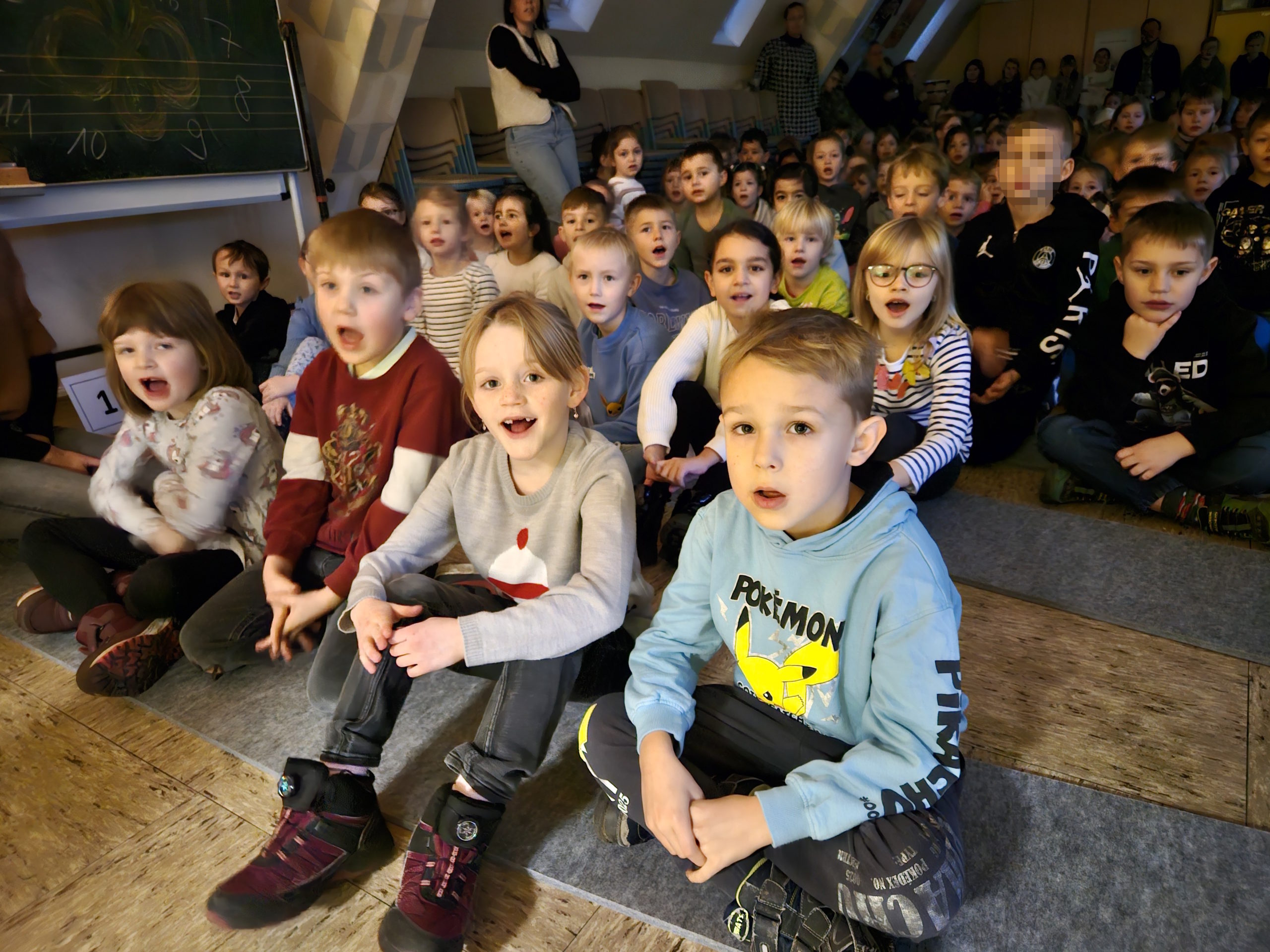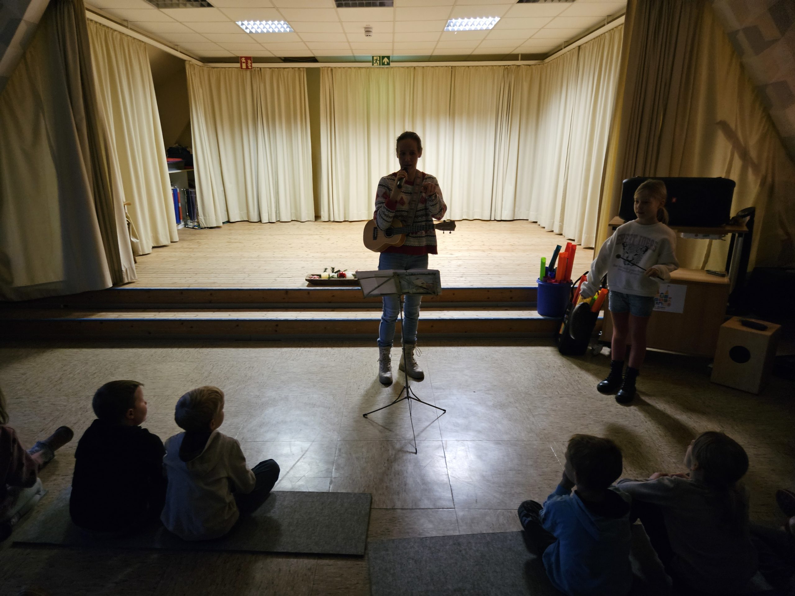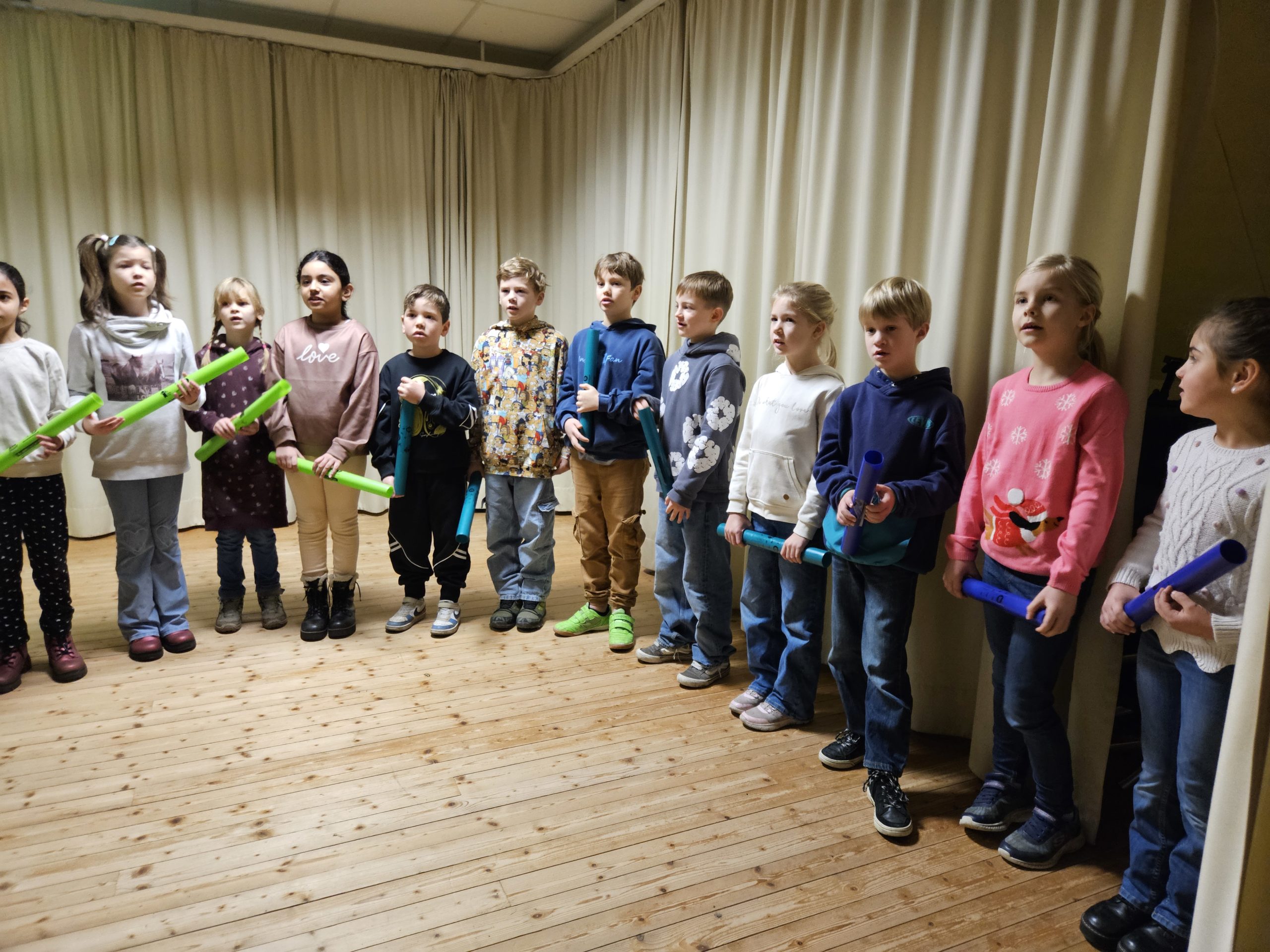 In der diesjährigen Adventszeit findet an unserer Schule wieder das wöchentliche Adventssingen statt. Dazu versammelten sich alle Kinder und ihre Lehrkräfte am Dienstag, den 02.12.25 zu Beginn der ersten Stunde in der Aula. Nachdem die erste Kerze am Adventskranz brannte, sangen alle gemeinsam die erste Strophe des Liedes „Das Licht einer Kerze“. Anschließend sang die Klasse 2b das Lied „Bruder Jakob“ zunächst im Kanon und anschließend spielten die Kinder es mit Boomwhackers. Zum Abschluss schmetterten alle gemeinsam „In der Weihnachtsbäckerei“.