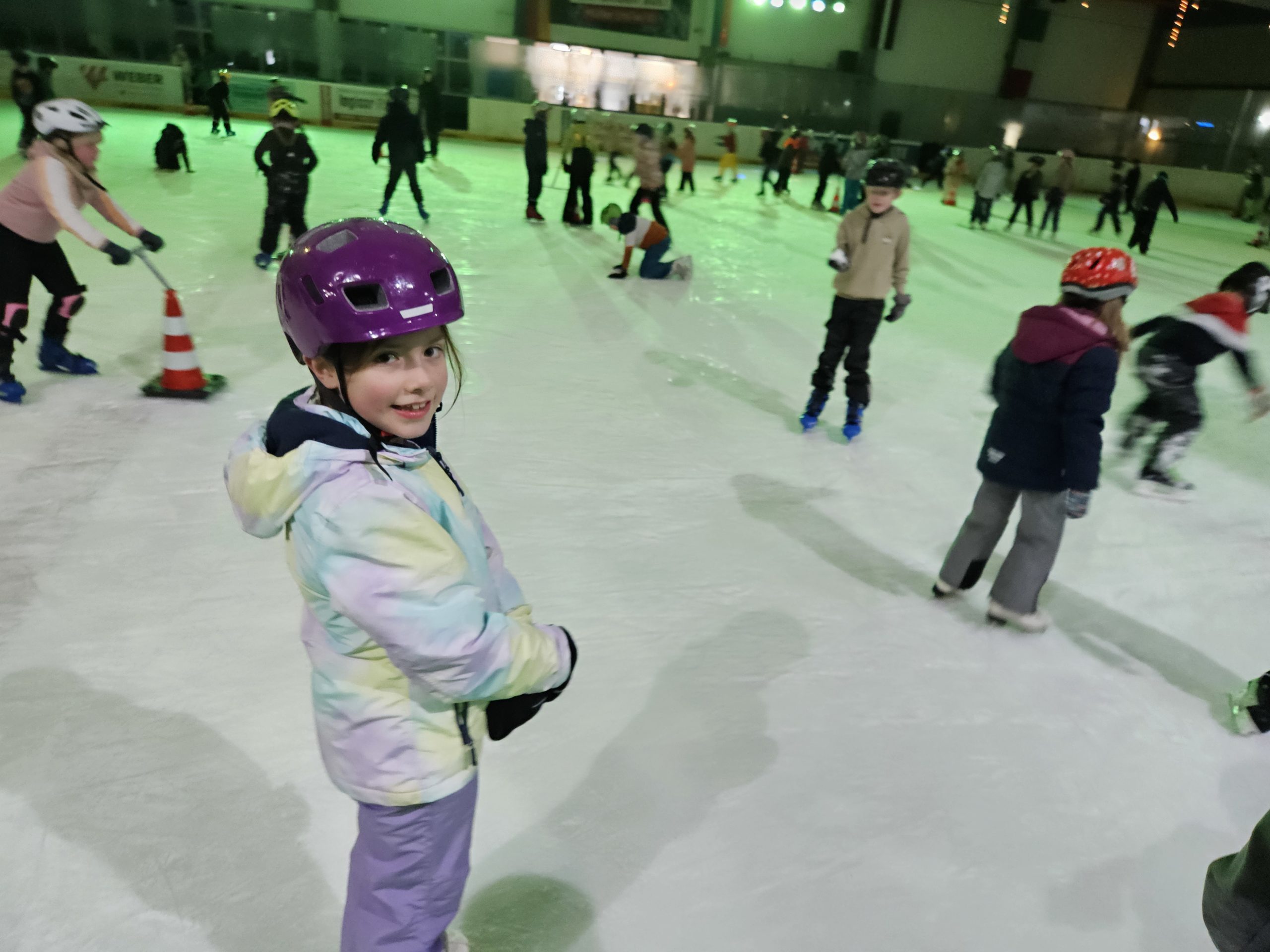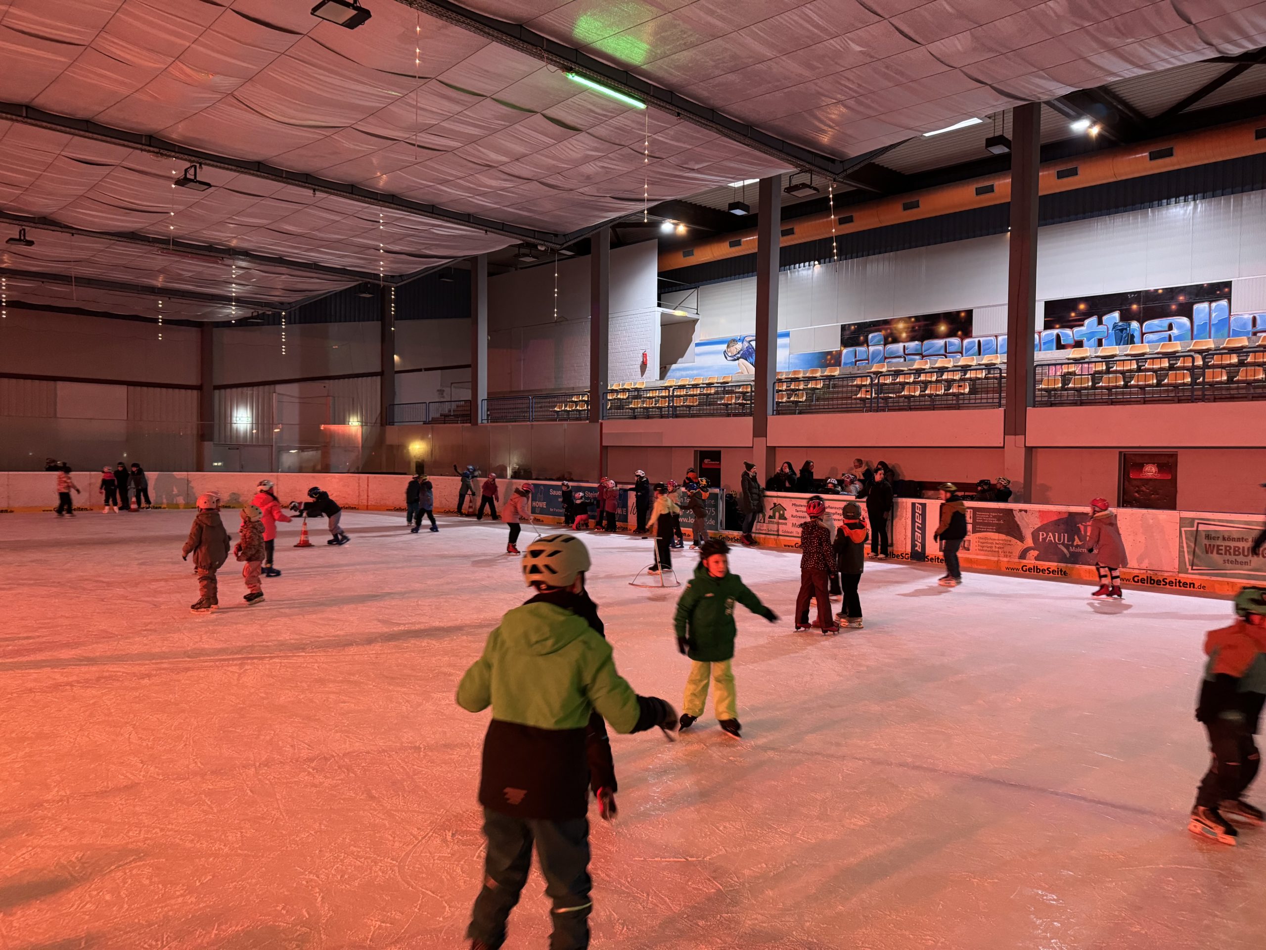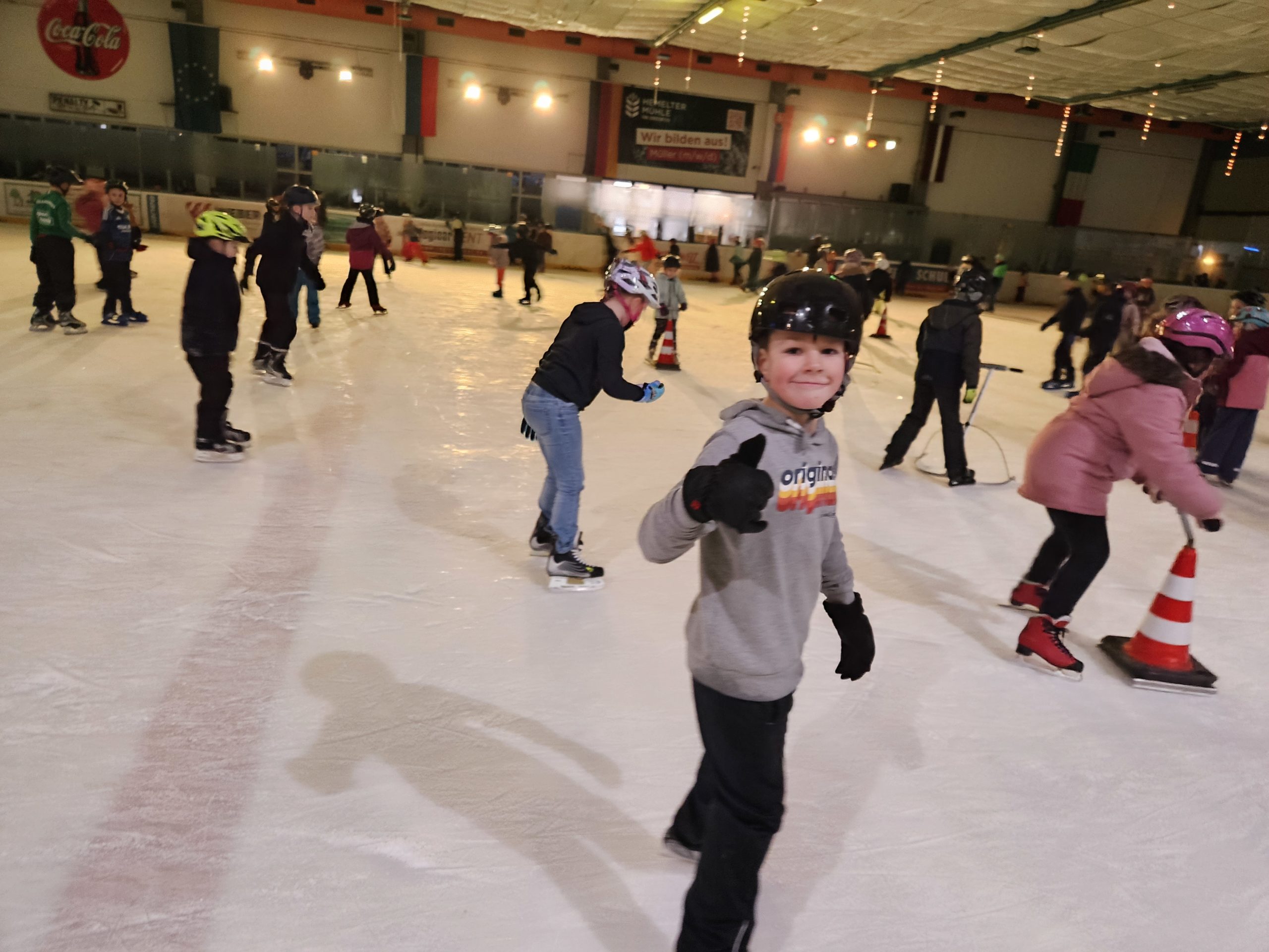 Am letzten Schultag des Jahres konnten die Kinder sich noch einmal über eine besondere Aktion freuen. Es ging wieder mit der gesamten Schule zur Eishalle nach Rheine. Dort hatten wir die gesamte Eisfläche für uns und die Kinder und Lehrkräfte konnten so manche Runde auf dem Eis drehen.