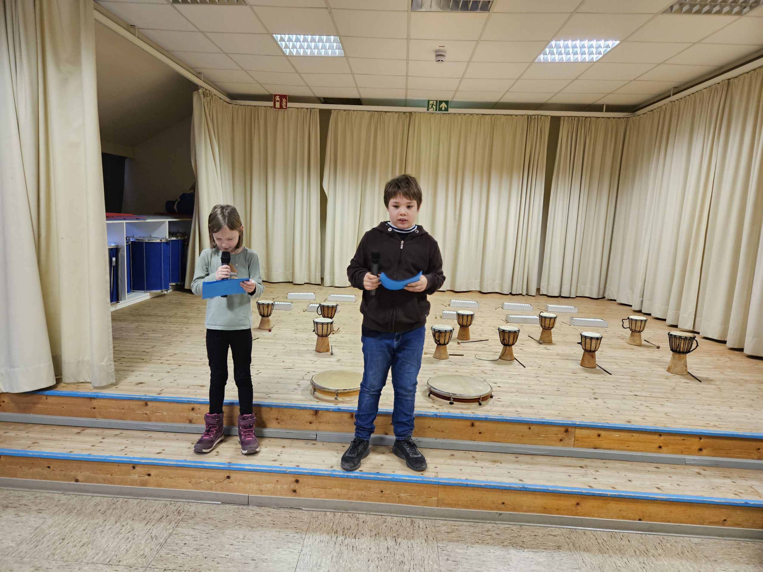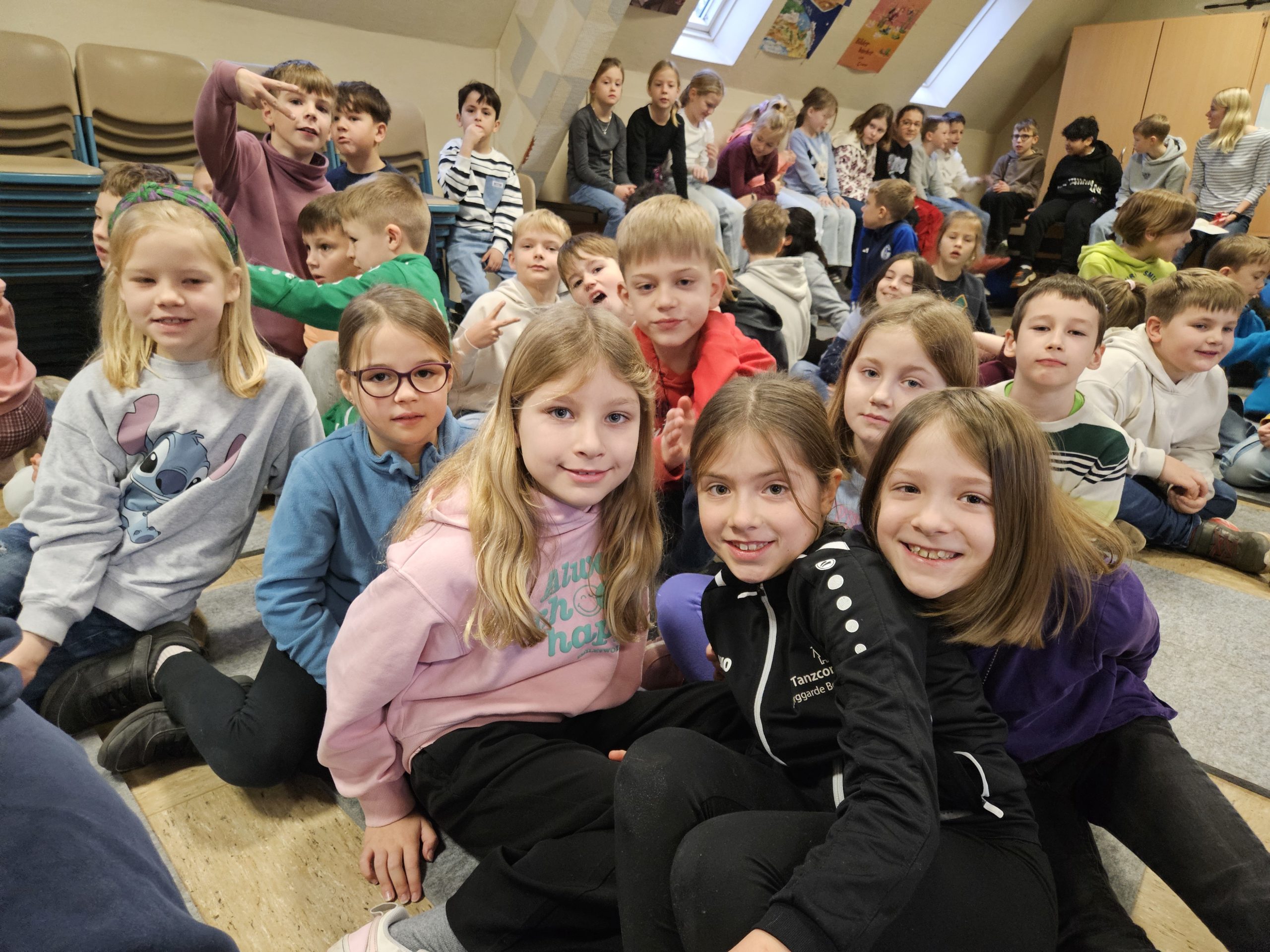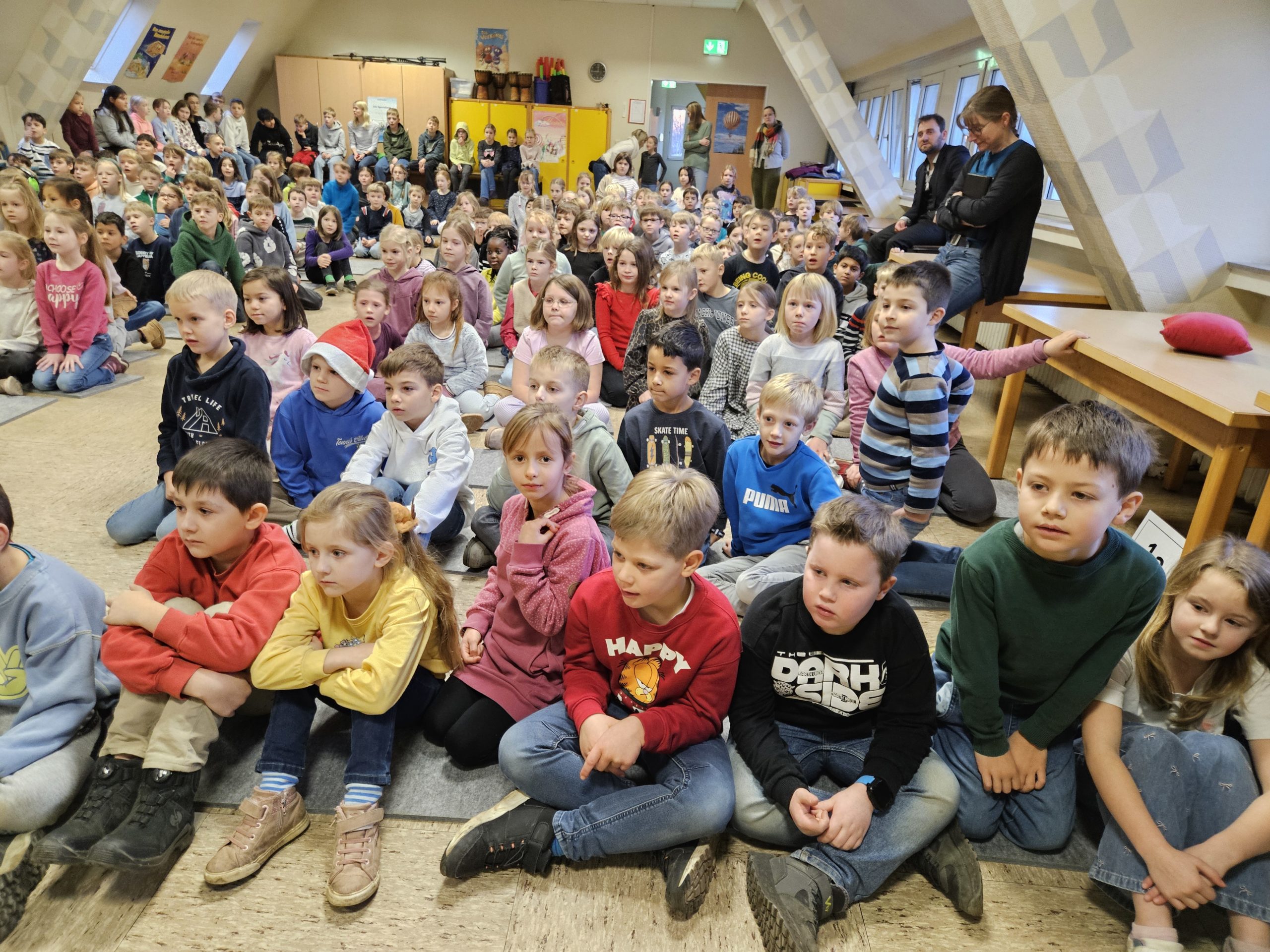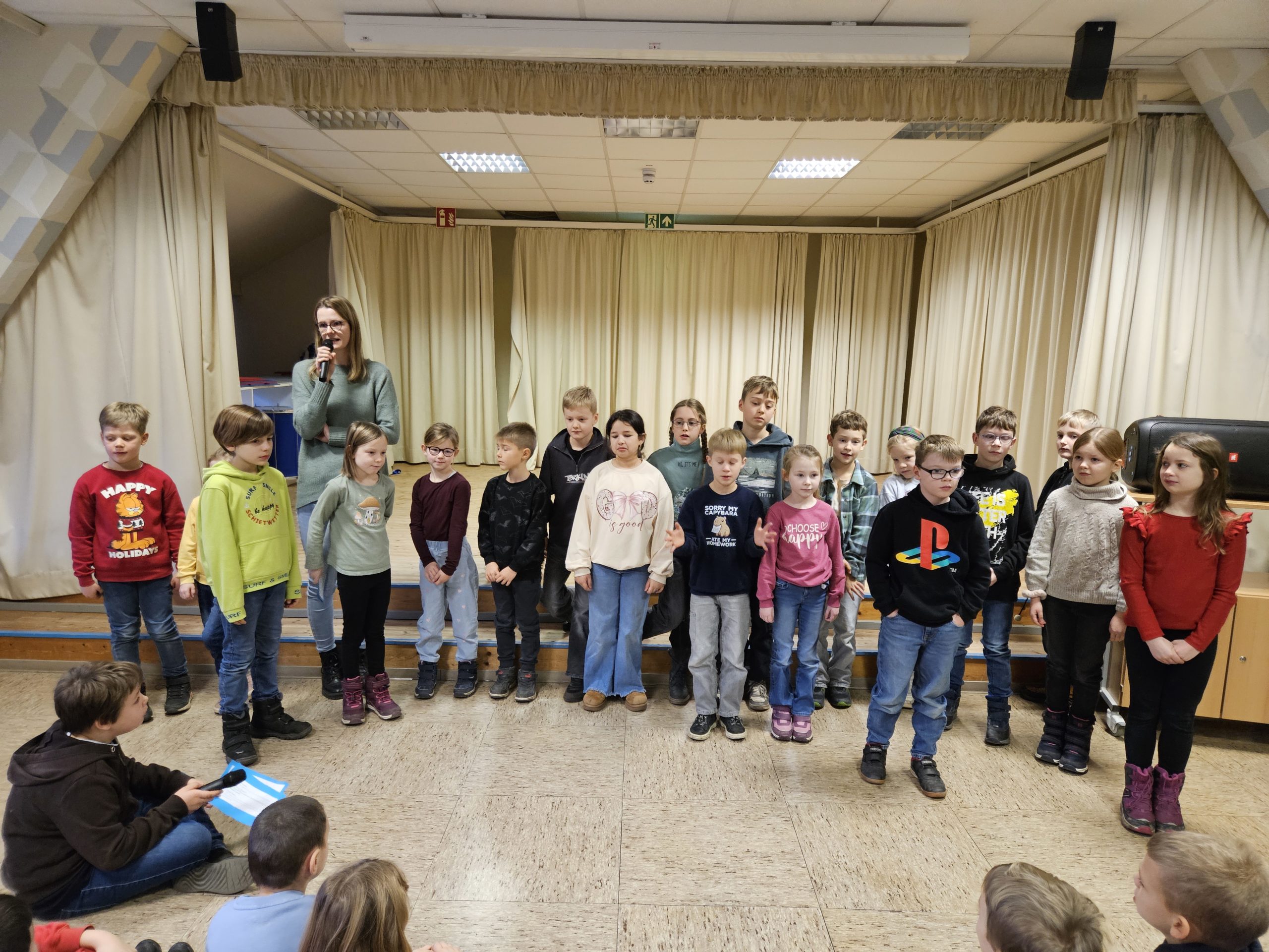 Die letzte Schulversammlung des Jahres fand am Donnerstag, den 18.12.25 in der Aula statt. Moderieren durften dieses Mal Leni und Liam aus der Klasse 3c. Den Beginn machte die Klasse 1a, die das Lied „Kleine Igel schlafen gern“ sangen und mit Instrumenten begleiteten. Danach spielten vier Kinder aus der Klasse 3c das Stück „Das Weihnachtswunder“ vor, bei dem vier Tiere auf ein Wunder an Weihnachten warteten. Anschließend stellte Frau Birke die neuen Pausenhelferinnen und Pausenhelfer vor, die nach den Weihnachtsferien ihren Dienst beginnen werden. Danach kamen alle Klassensprecherinnen und Klassensprecher nach vorne, die gemeinsam mit Frau Birke in der Kinderkonferenz eine Überraschung für die Lehrkräfte vorbereitet hatten, die sie dann überreichten. Zum Abschluss zeigte die Klasse 2a einen Tüchertanz zu einem Weihnachtslied auf der Bühne.