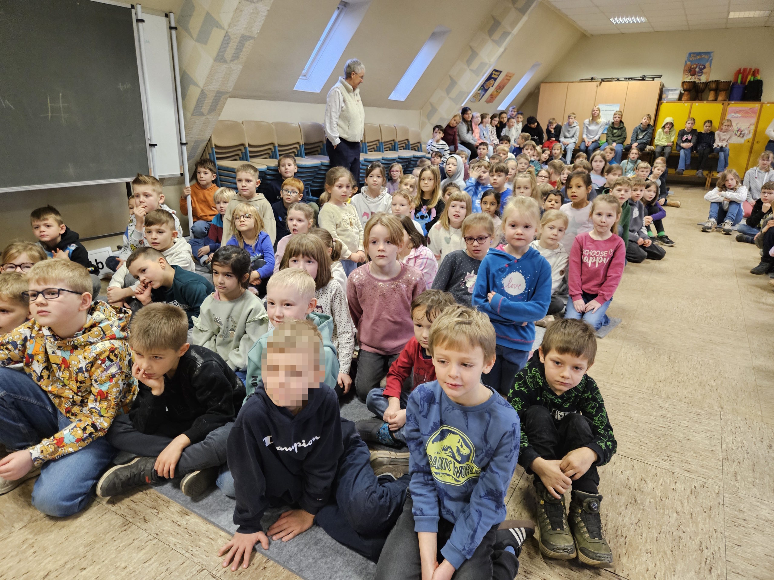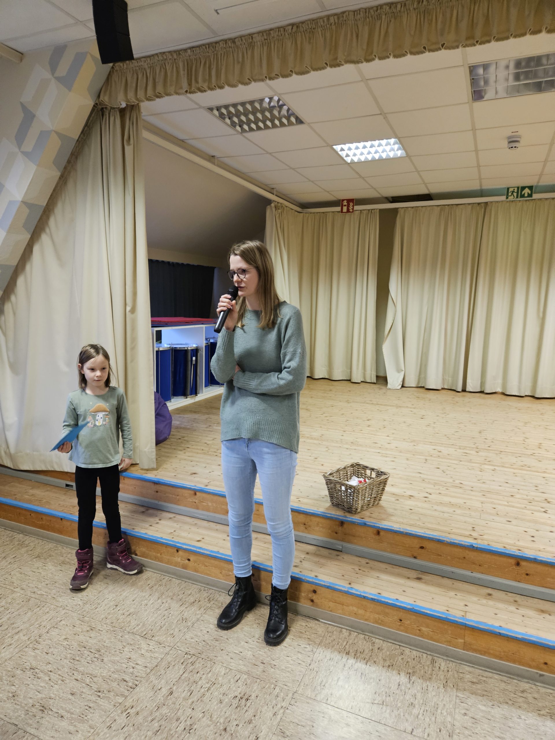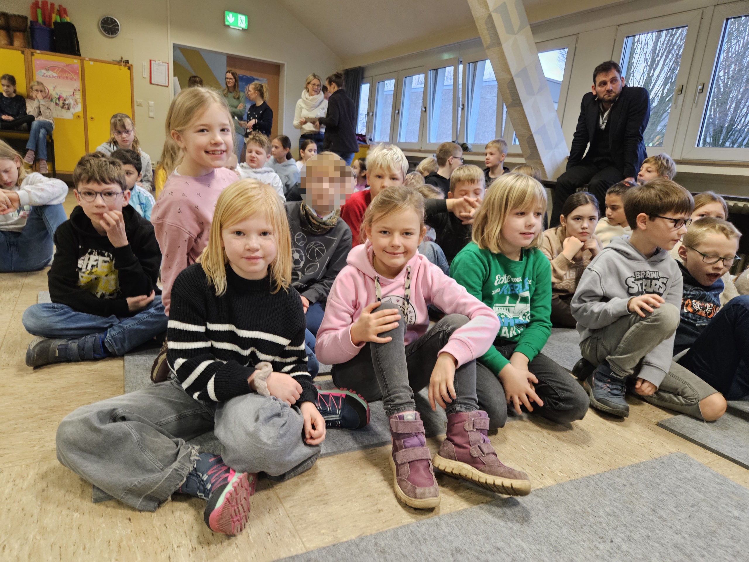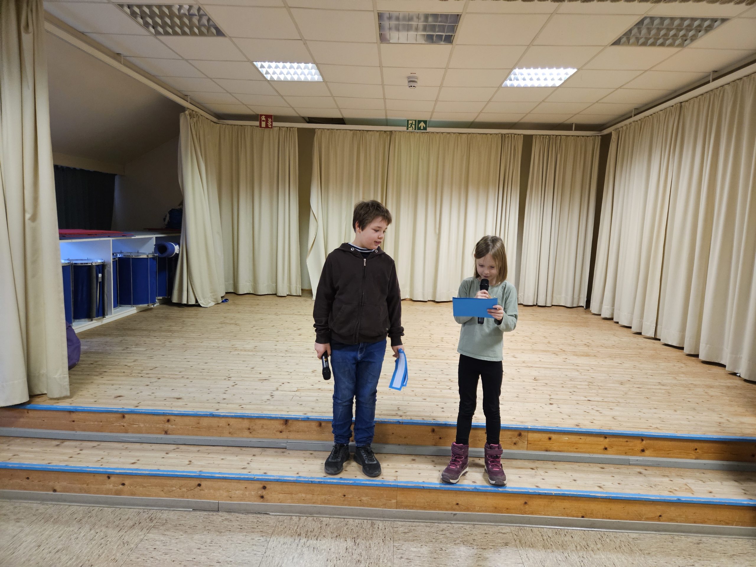 Die letzte Schulversammlung des Jahres fand am Donnerstag, den 18.12.25 in der Aula statt. Moderieren durften dieses Mal Leni und Liam aus der Klasse 3c. Den Beginn machte die Klasse 1a, die das Lied „Kleine Igel schlafen gern“ sangen und mit Instrumenten begleiteten. Danach spielten vier Kinder aus der Klasse 3c das Stück „Das Weihnachtswunder“ vor, bei dem vier Tiere auf ein Wunder an Weihnachten warteten. Anschließend stellte Frau Birke die neuen Pausenhelferinnen und Pausenhelfer vor, die nach den Weihnachtsferien ihren Dienst beginnen werden. Danach kamen alle Klassensprecherinnen und Klassensprecher nach vorne, die gemeinsam mit Frau Birke in der Kinderkonferenz eine Überraschung für die Lehrkräfte vorbereitet hatten, die sie dann überreichten. Zum Abschluss zeigte die Klasse 2a einen Tüchertanz zu einem Weihnachtslied auf der Bühne.
