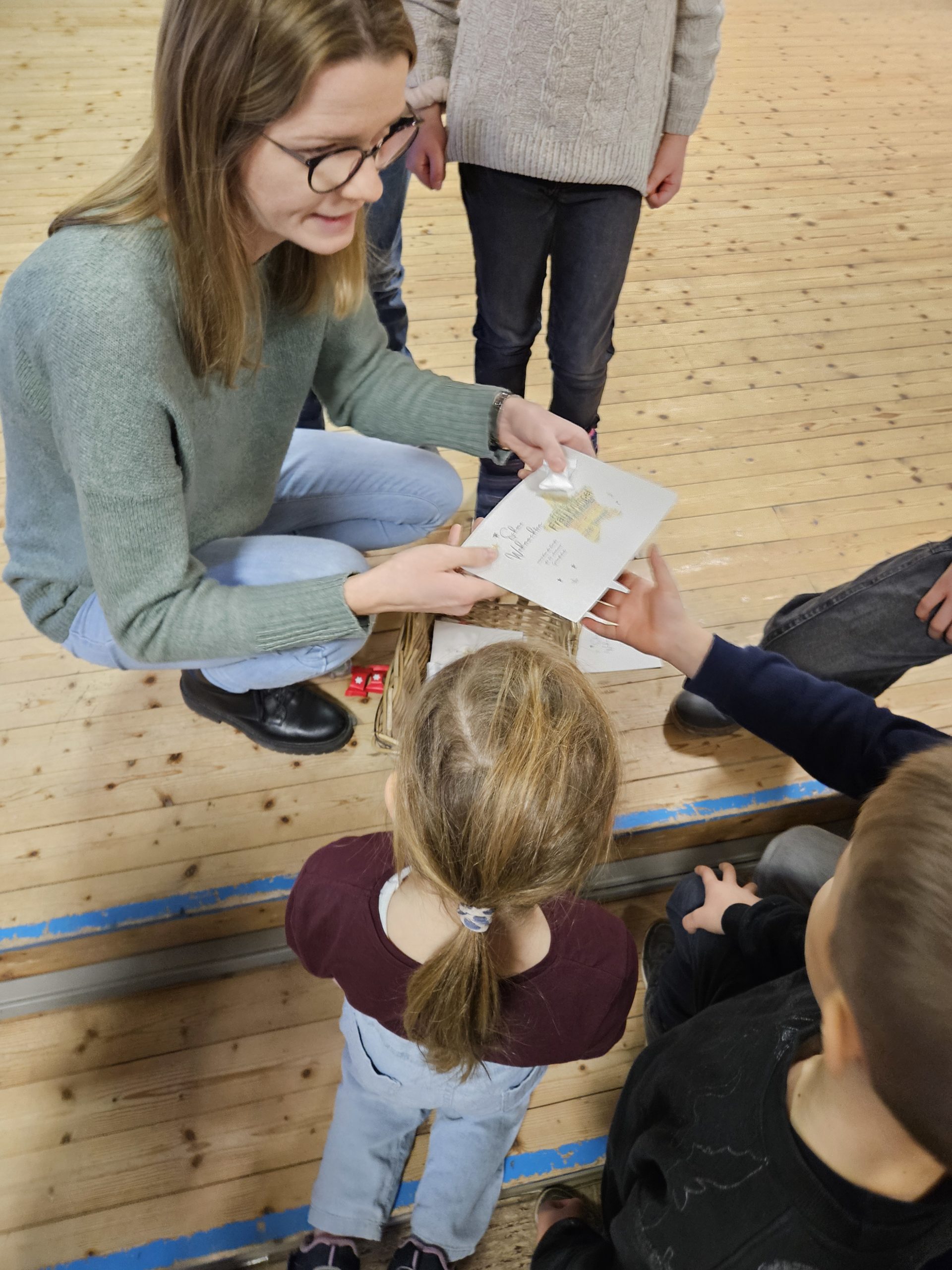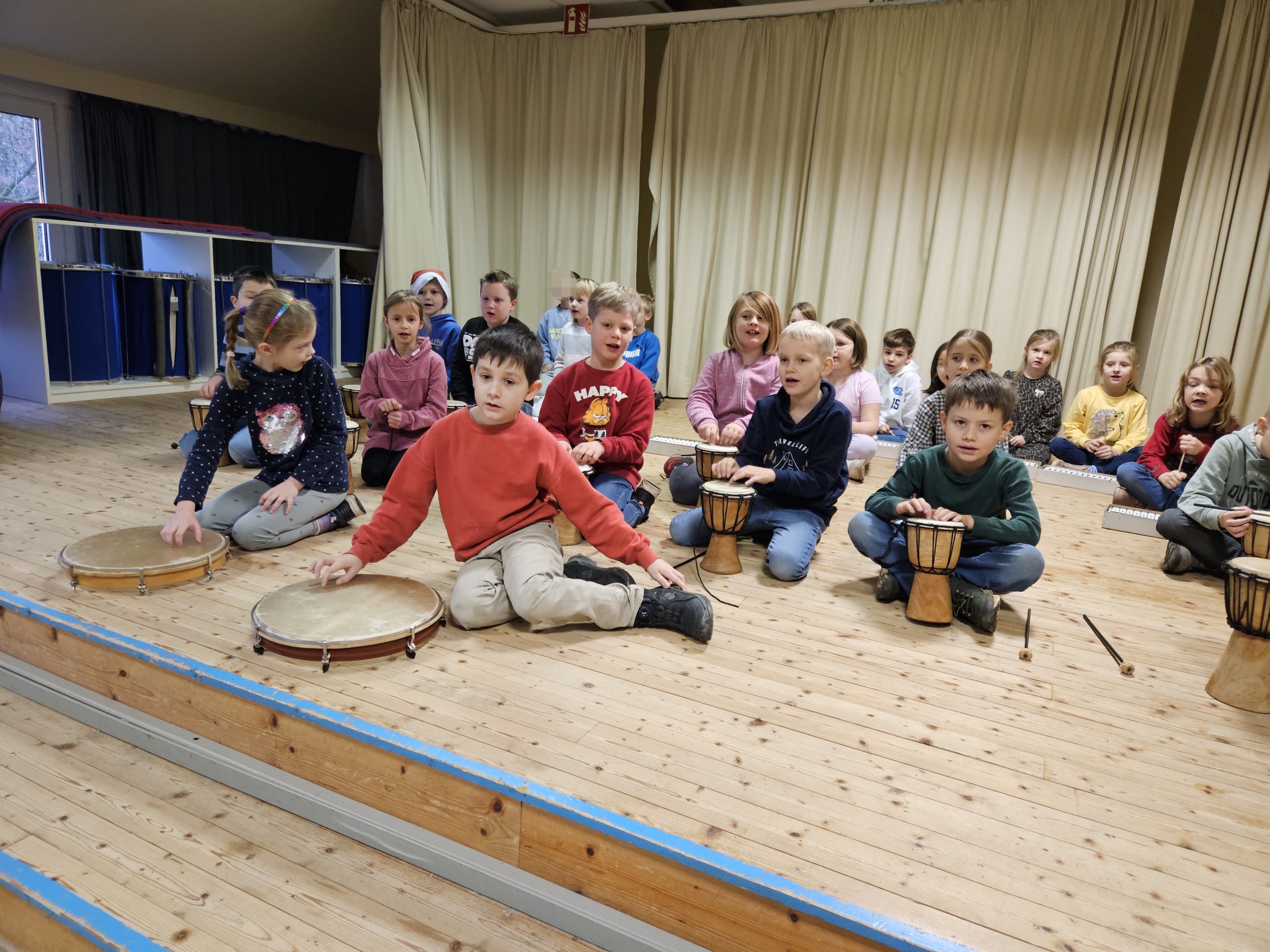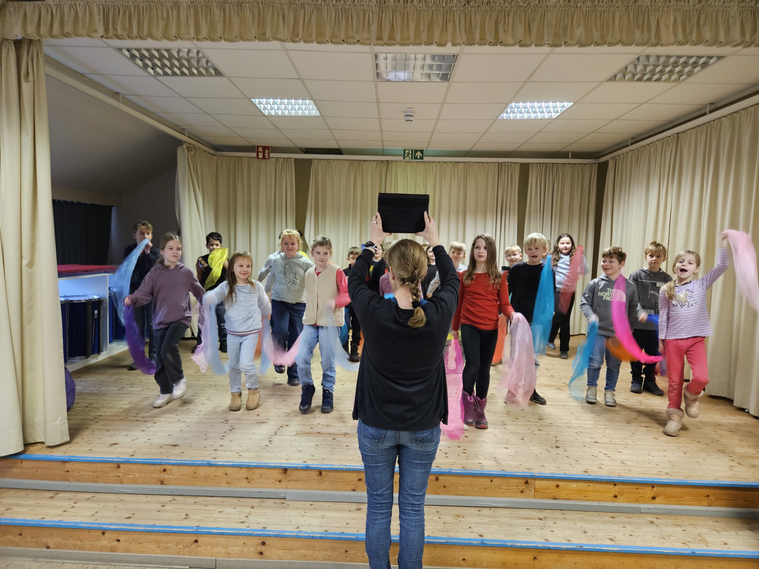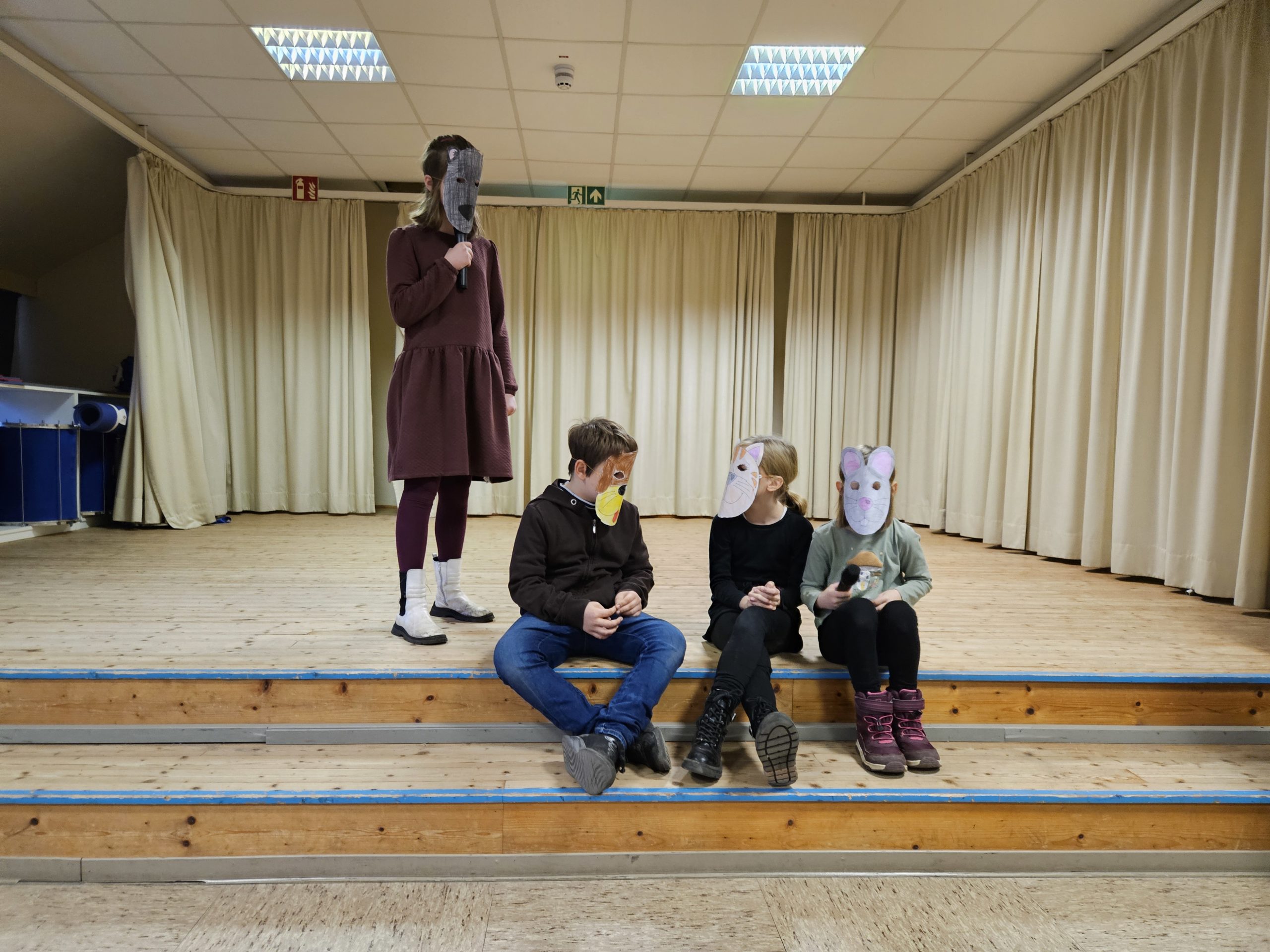 Die letzte Schulversammlung des Jahres fand am Donnerstag, den 18.12.25 in der Aula statt. Moderieren durften dieses Mal Leni und Liam aus der Klasse 3c. Den Beginn machte die Klasse 1a, die das Lied „Kleine Igel schlafen gern“ sangen und mit Instrumenten begleiteten. Danach spielten vier Kinder aus der Klasse 3c das Stück „Das Weihnachtswunder“ vor, bei dem vier Tiere auf ein Wunder an Weihnachten warteten. Anschließend stellte Frau Birke die neuen Pausenhelferinnen und Pausenhelfer vor, die nach den Weihnachtsferien ihren Dienst beginnen werden. Danach kamen alle Klassensprecherinnen und Klassensprecher nach vorne, die gemeinsam mit Frau Birke in der Kinderkonferenz eine Überraschung für die Lehrkräfte vorbereitet hatten, die sie dann überreichten. Zum Abschluss zeigte die Klasse 2a einen Tüchertanz zu einem Weihnachtslied auf der Bühne.