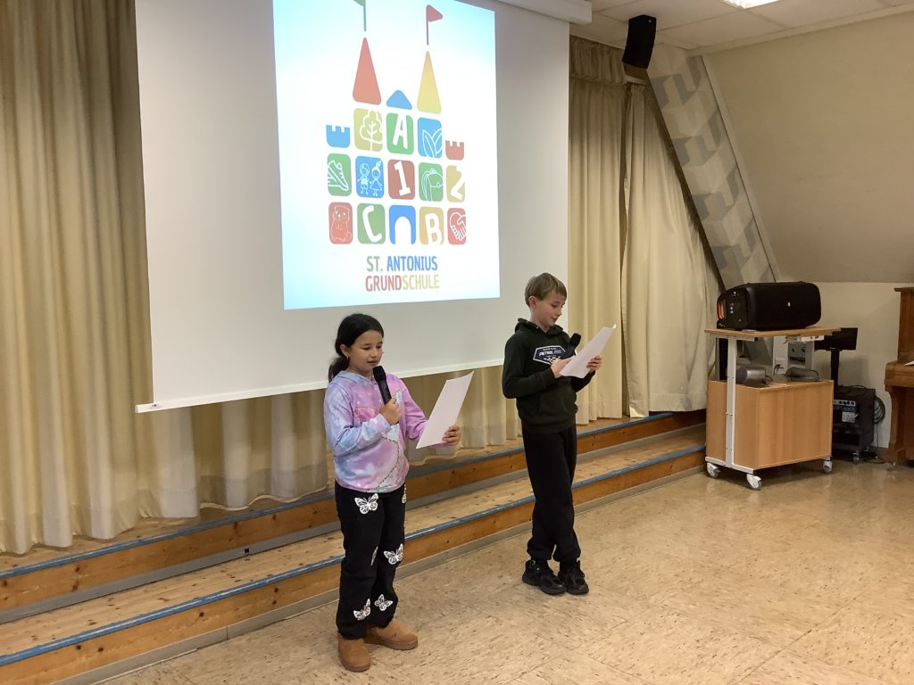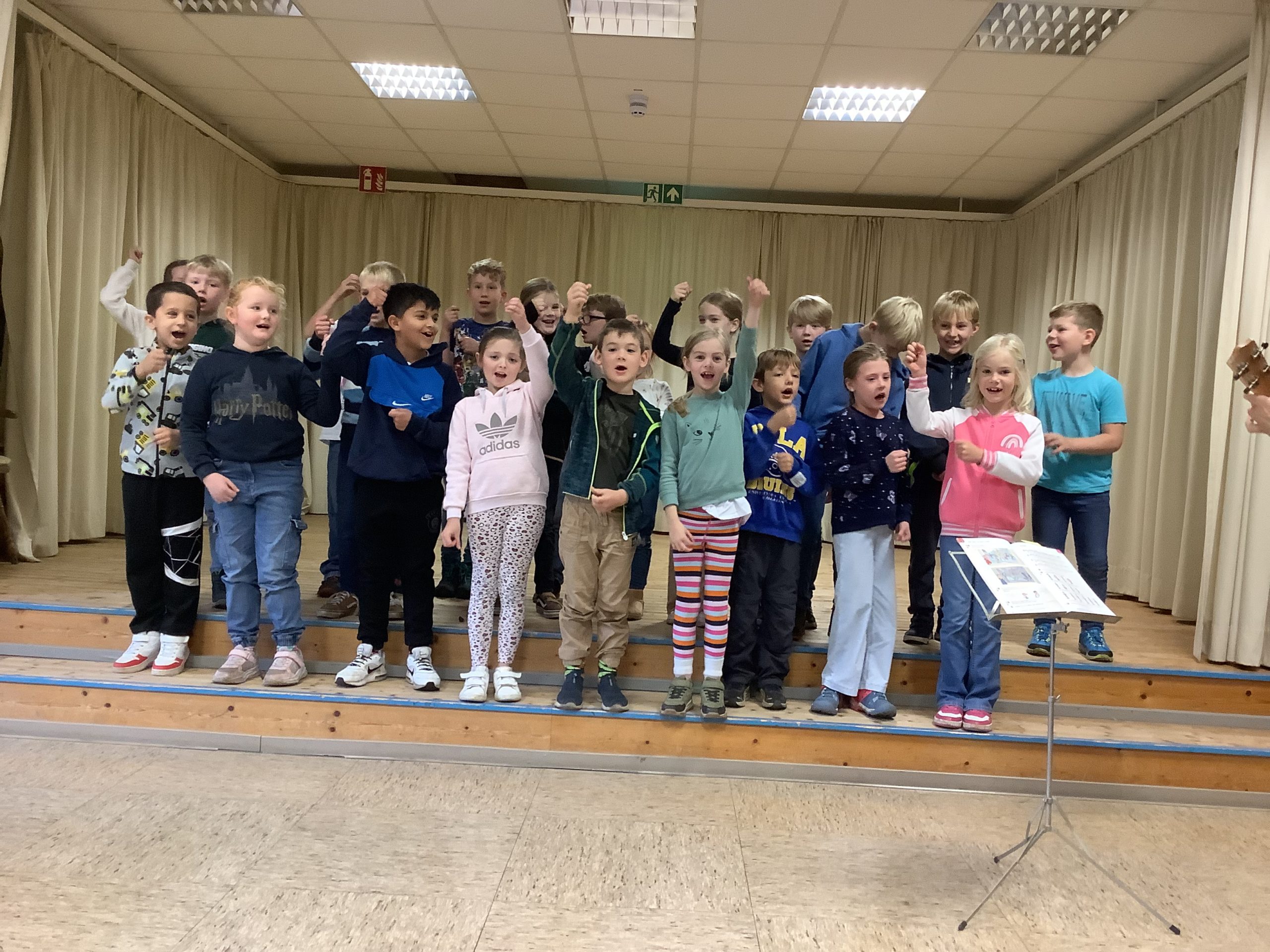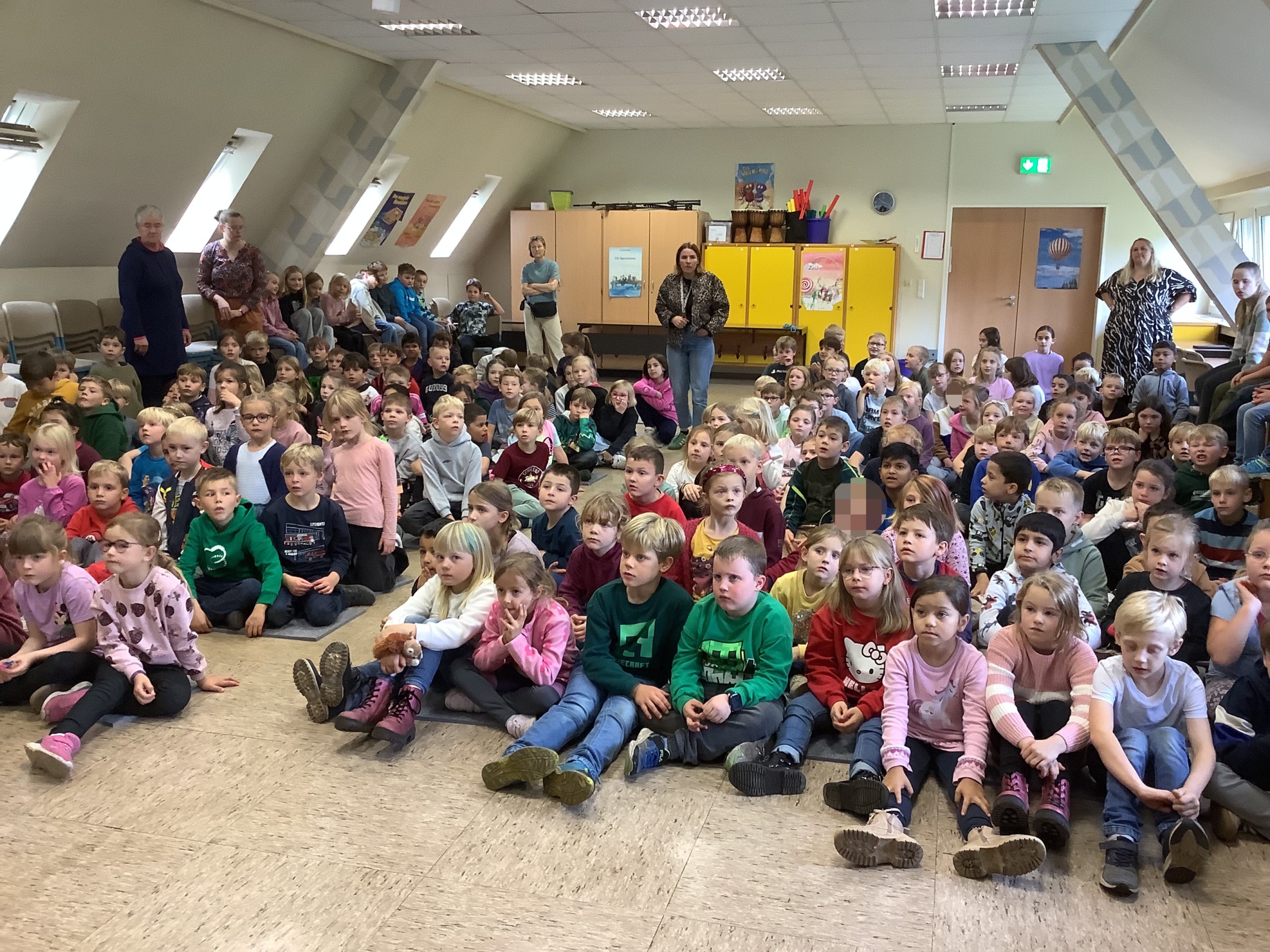 Am Freitag, den 10.10.25 fand die erste Schulversammlung des Schuljahres statt. In der dritten Stunde versammelten sich alle Kinder und Lehrkräfte dazu in der Aula. Moderieren durften dieses Mal Amelie und Martin aus der Klasse 4a. Den Anfang machte die Klasse 1b, die das Lied „Wir sind Kinder einer Welt“ sangen und mit Trommeln und Bewegungen begleiteten. Anschließend berichteten Pia und Sofia aus der Klasse 3c von dem Projekt „Wir wollen mobbingfrei“, das in der letzten Woche für die dritten und vierten Klassen stattgefunden hat. Die Klasse 4a hat im Kunstunterricht Bilder gestaltet, die das Treppenhaus zur Aula schmücken sollen. Diese zeigten sie auf der Schulversammlung. Zum Abschluss präsentierte die Klasse 2a noch ein Lied auf der Bühne, das sie im Musikunterricht eingeübt hatten.