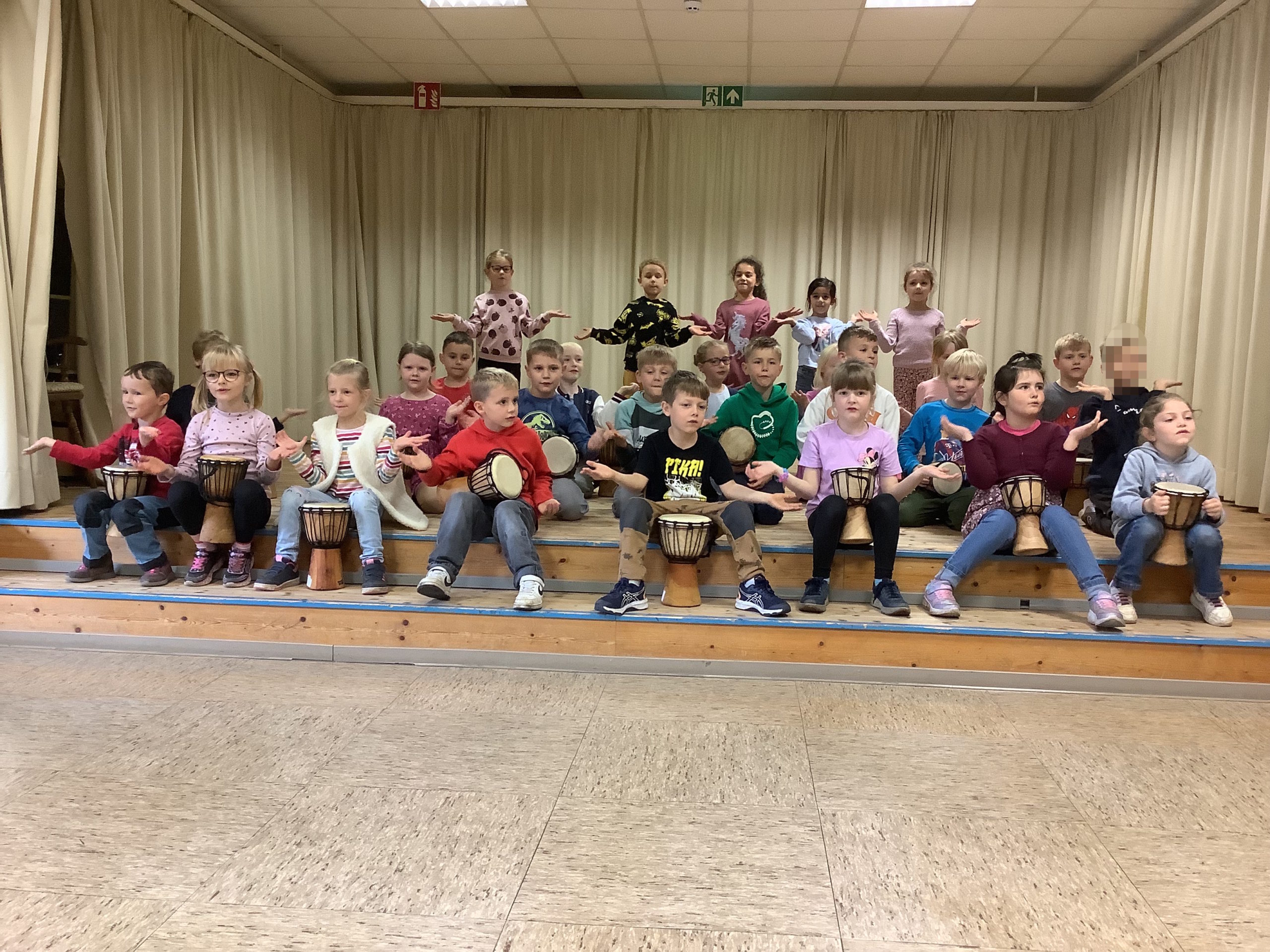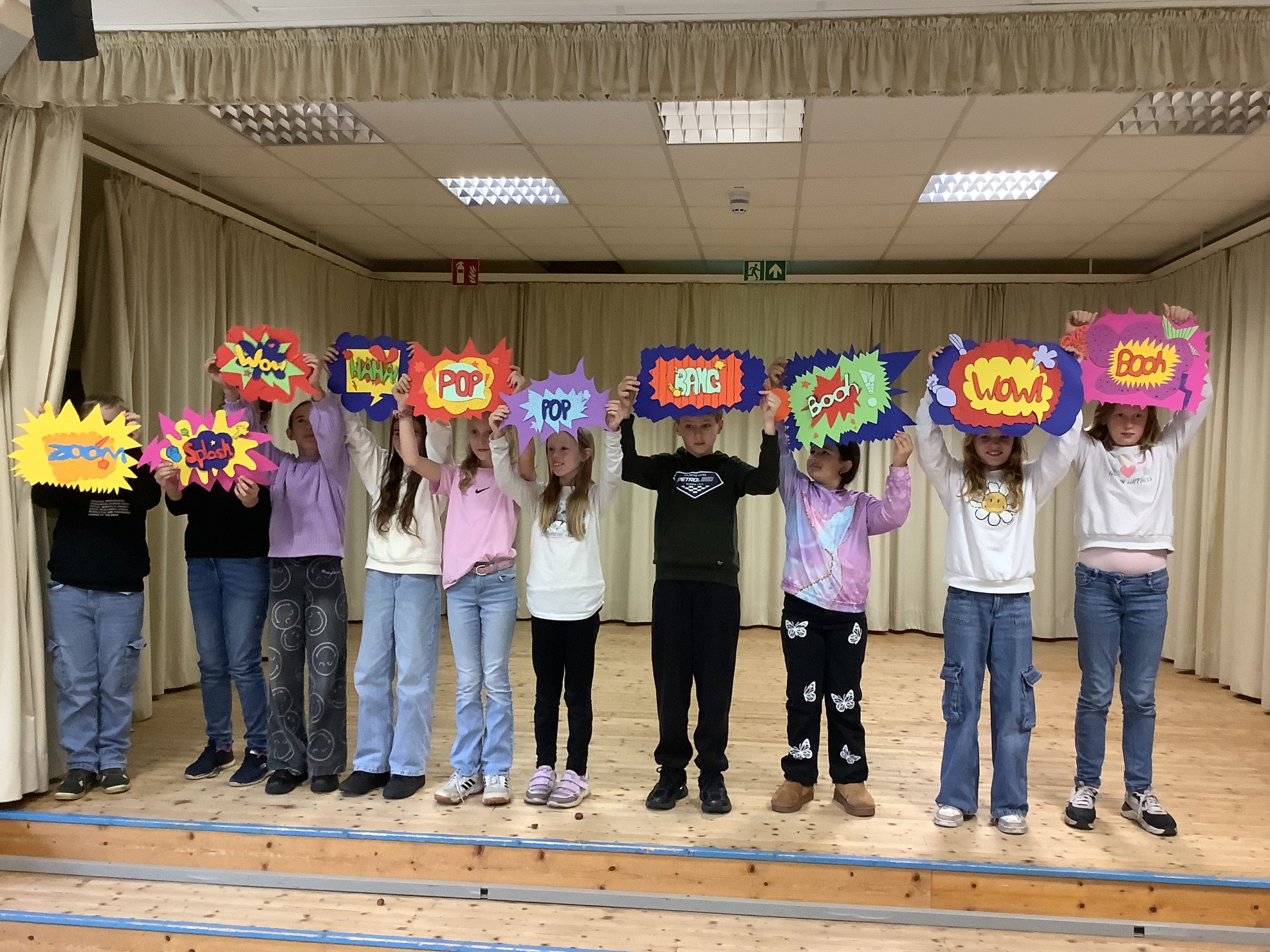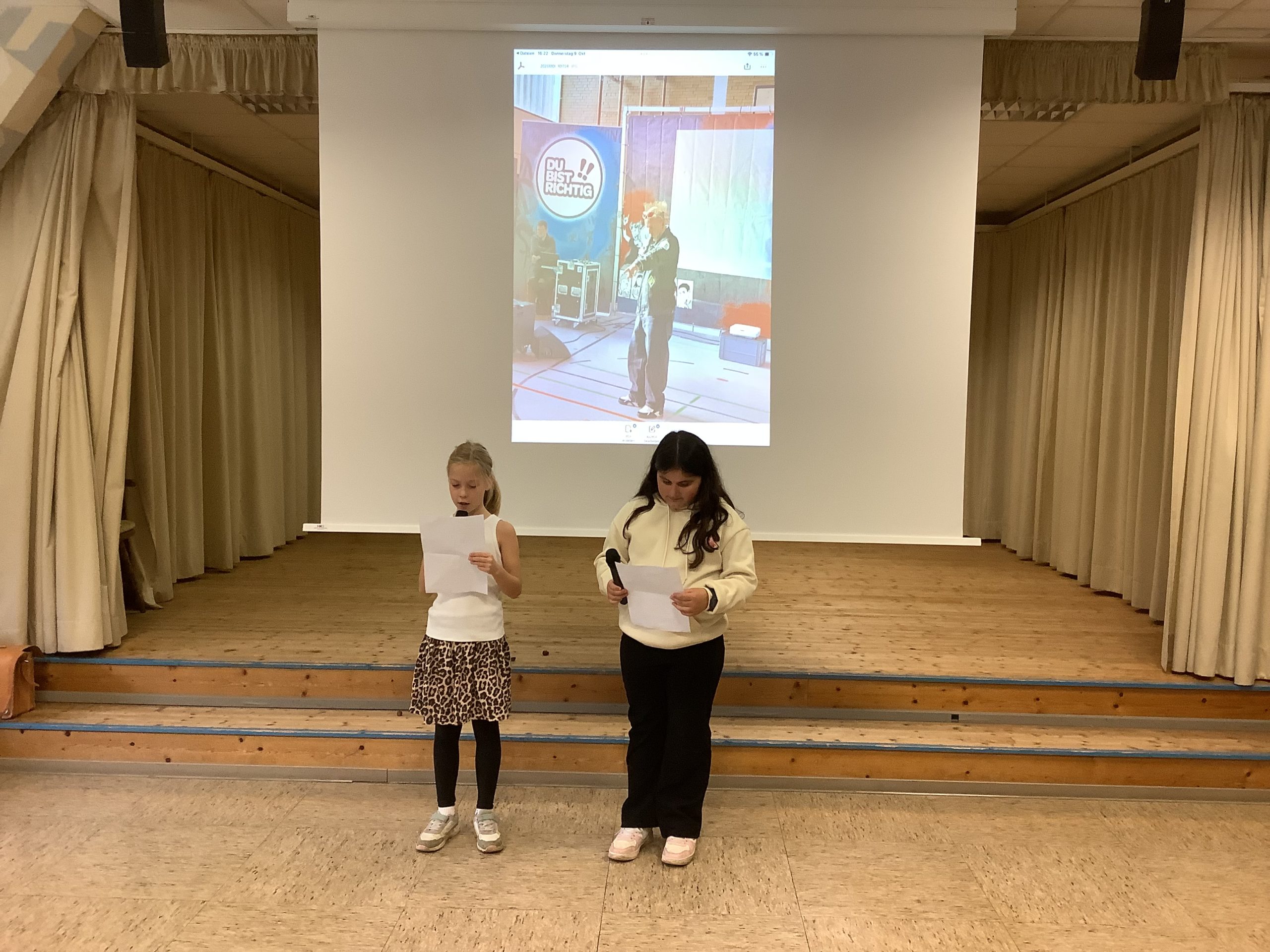 Am Freitag, den 10.10.25 fand die erste Schulversammlung des Schuljahres statt. In der dritten Stunde versammelten sich alle Kinder und Lehrkräfte dazu in der Aula. Moderieren durften dieses Mal Amelie und Martin aus der Klasse 4a. Den Anfang machte die Klasse 1b, die das Lied „Wir sind Kinder einer Welt“ sangen und mit Trommeln und Bewegungen begleiteten. Anschließend berichteten Pia und Sofia aus der Klasse 3c von dem Projekt „Wir wollen mobbingfrei“, das in der letzten Woche für die dritten und vierten Klassen stattgefunden hat. Die Klasse 4a hat im Kunstunterricht Bilder gestaltet, die das Treppenhaus zur Aula schmücken sollen. Diese zeigten sie auf der Schulversammlung. Zum Abschluss präsentierte die Klasse 2a noch ein Lied auf der Bühne, das sie im Musikunterricht eingeübt hatten.