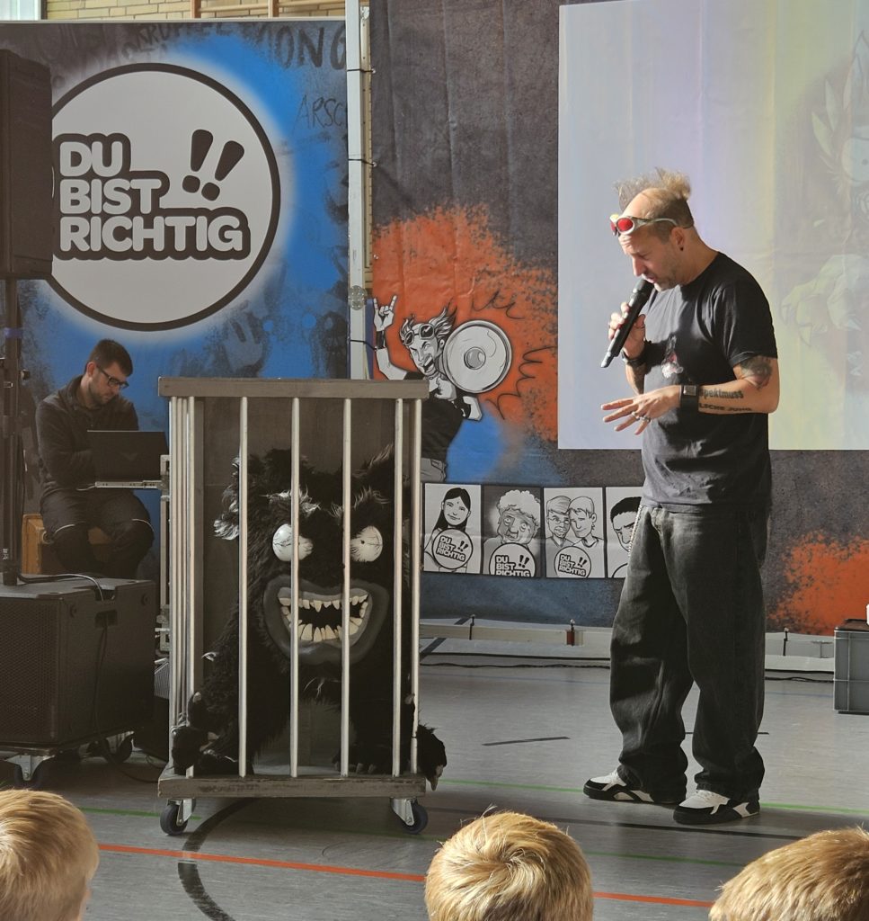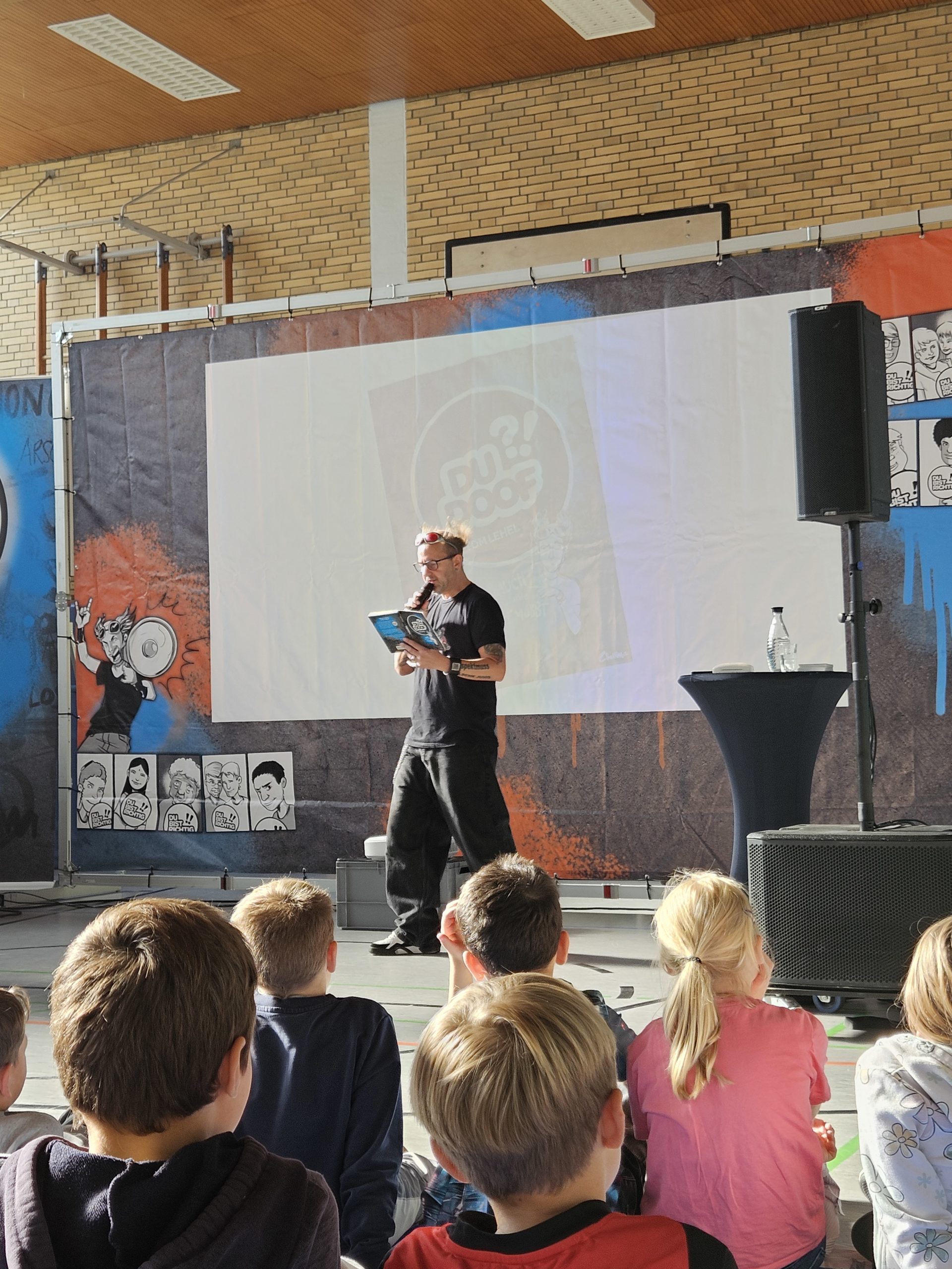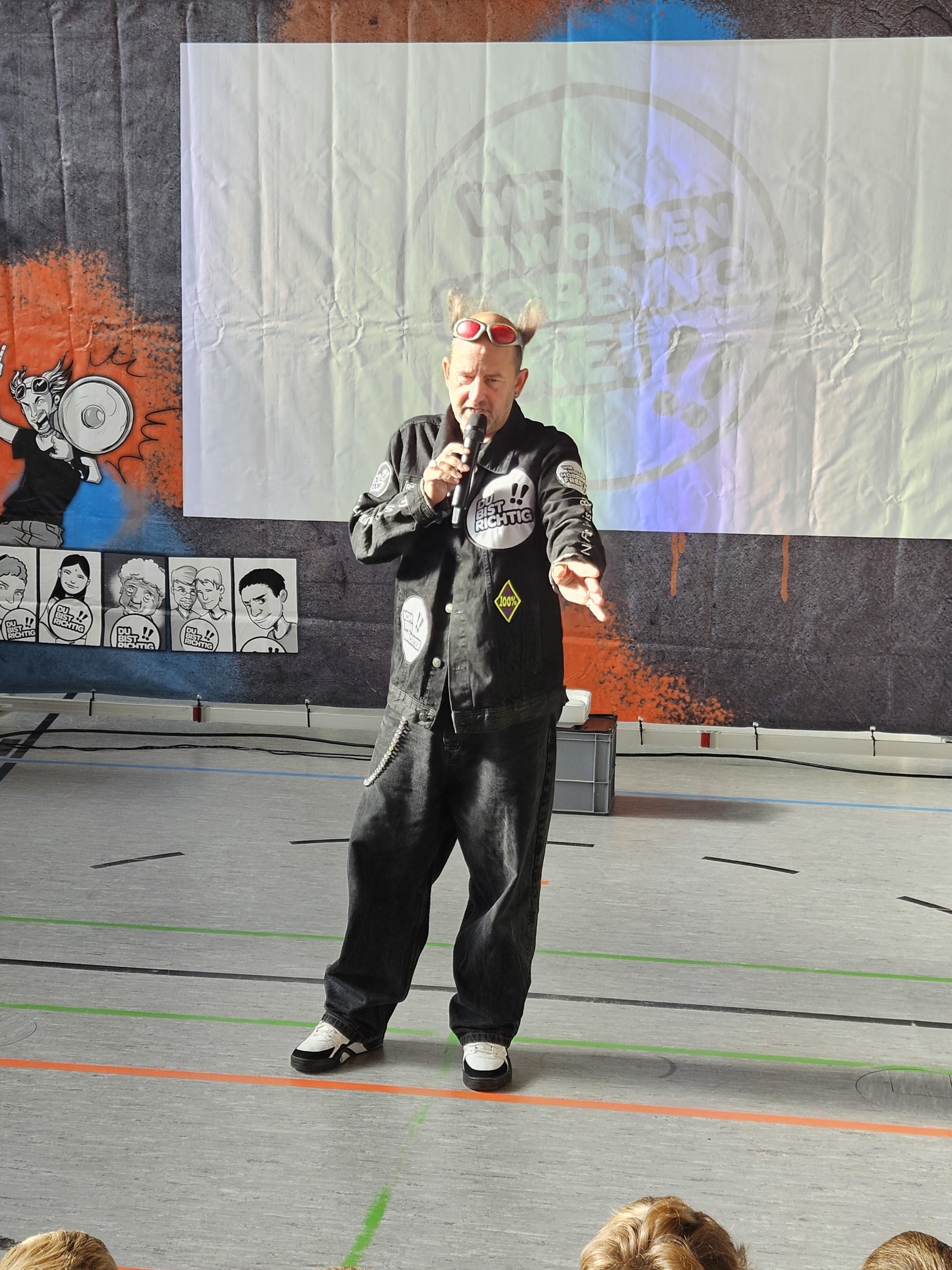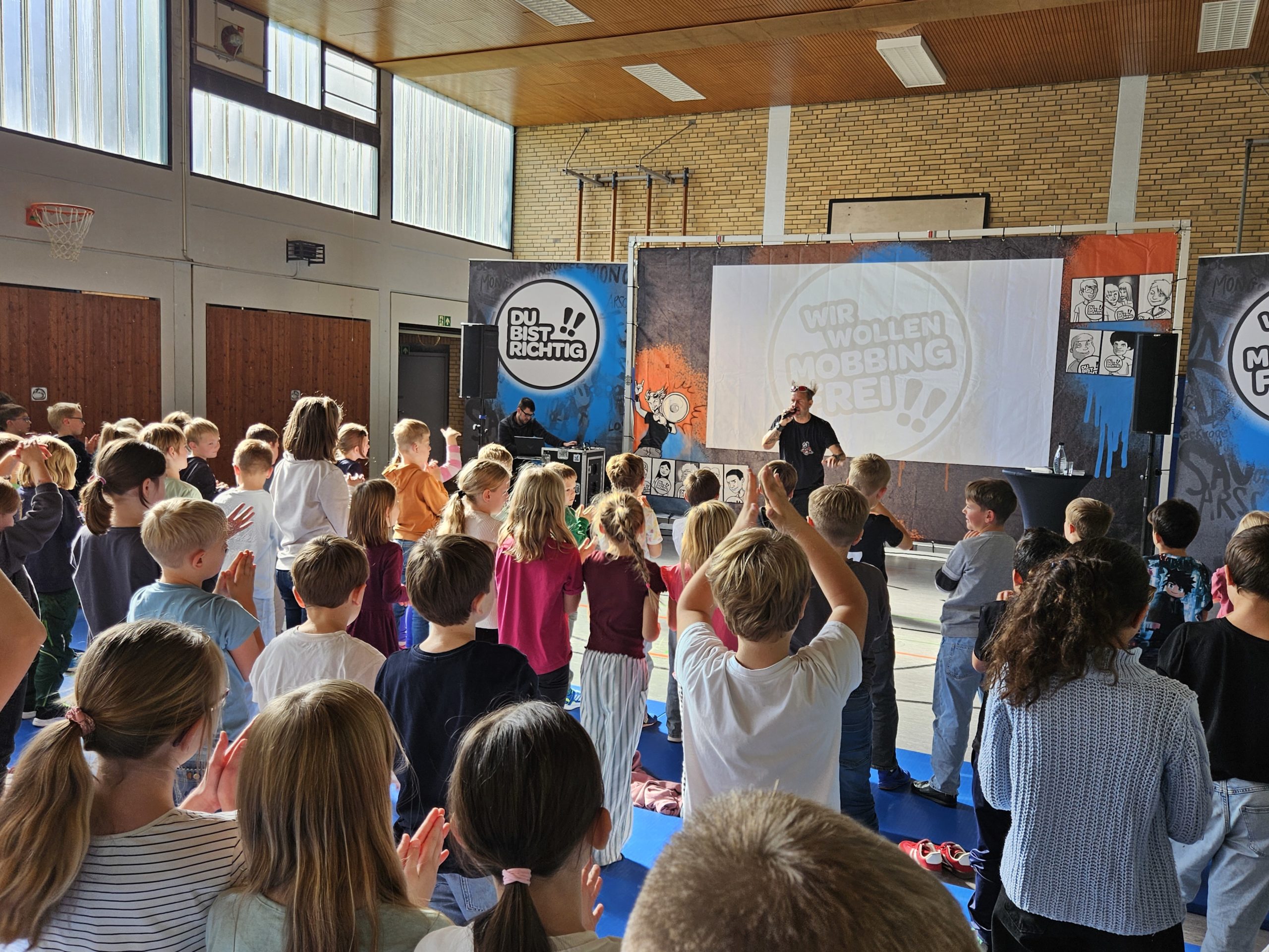 Am Mittwoch, den 01.10.25 gab es für den 3. und 4. Jahrgang ein besonderes Schulevent. Zu Besuch war Tom Lehel (bekannt durch KIKA und ZDF). Tom hat den Kindern von seinen eigenen Mobbingerfahrungen erzählt und die Kinder über das Thema informiert. In Rollenspielen und Gesprächen lernten die Kinder, wie sie sich in Mobbing-Situationen verhalten können und was sie tun sollten, wenn sie selbst oder andere Mobbing erleben. Tom Lehel sensibilisierte die Kinder für die Bedeutung von Freundschaft, Respekt und Zusammenhalt. Seine coolen Pop- und Rocksongs luden zum Mitsingen und Mittanzen ein und machen das Event zu einem unvergesslichen Erlebnis!