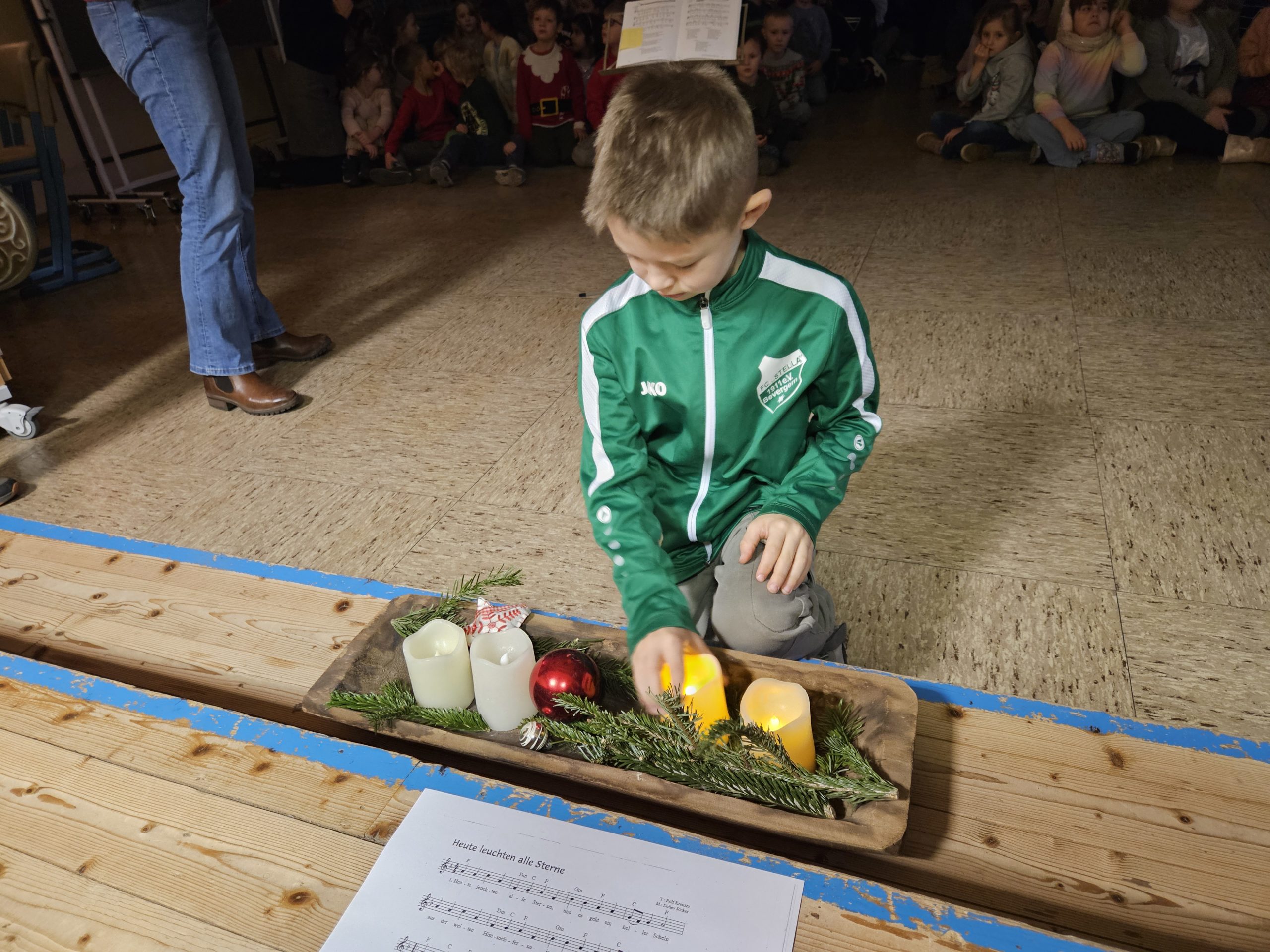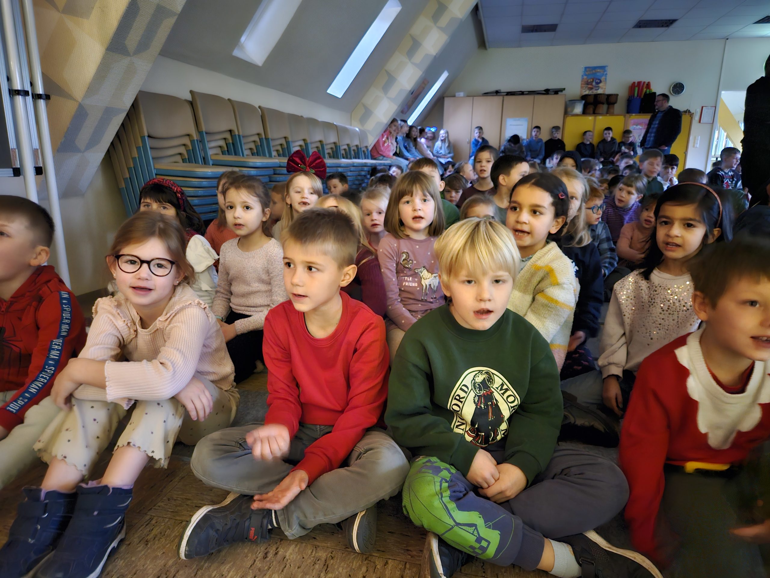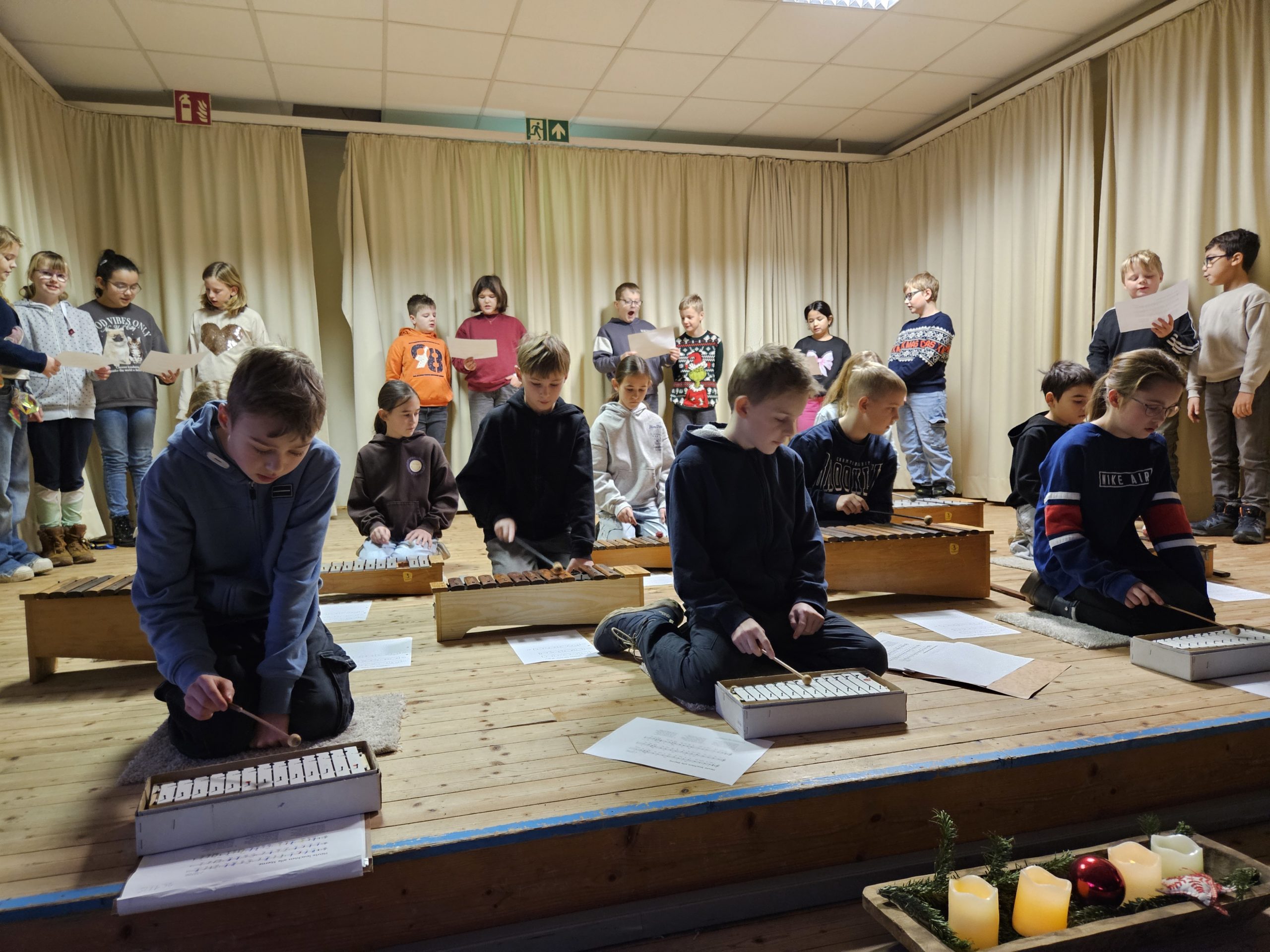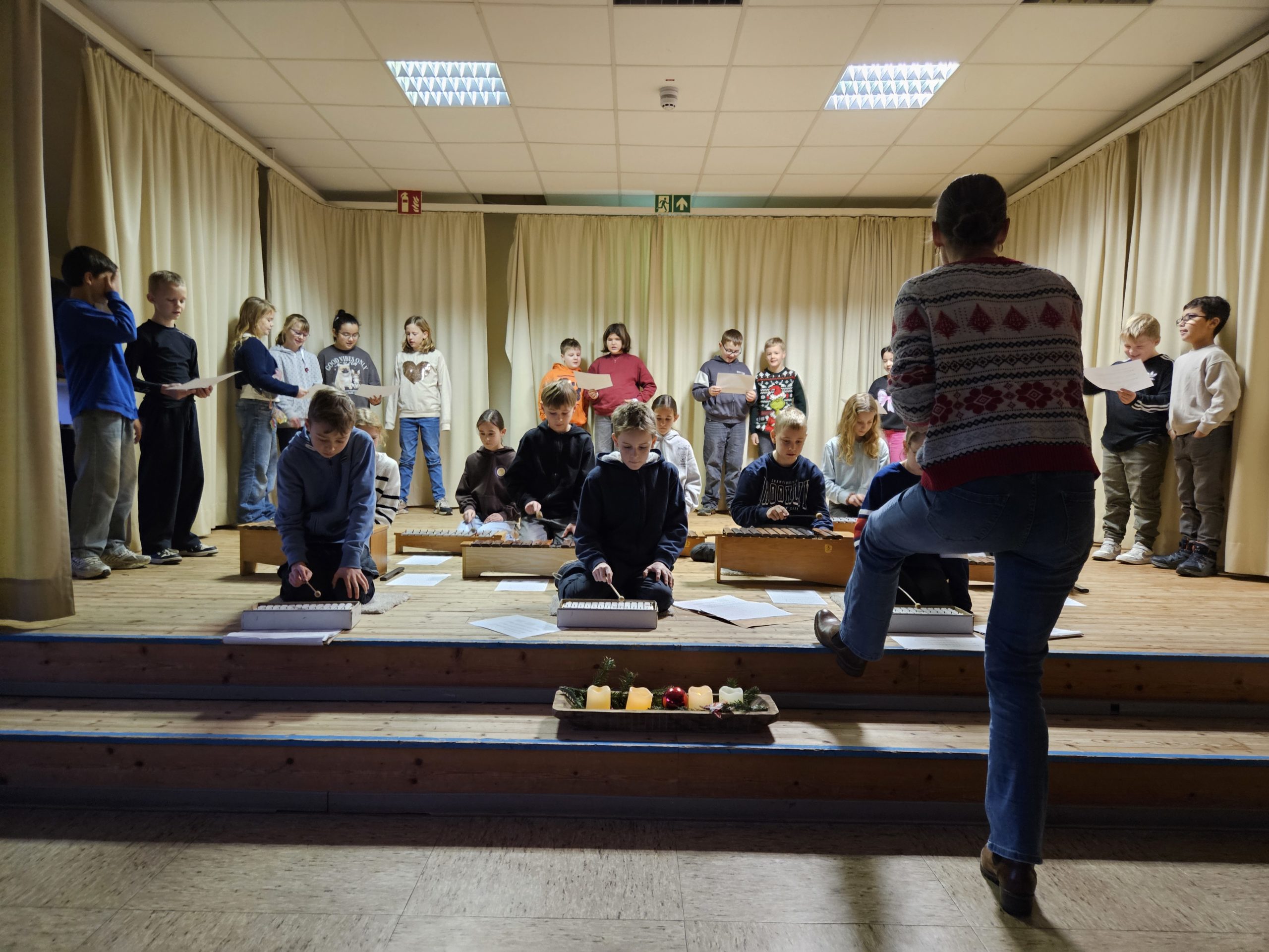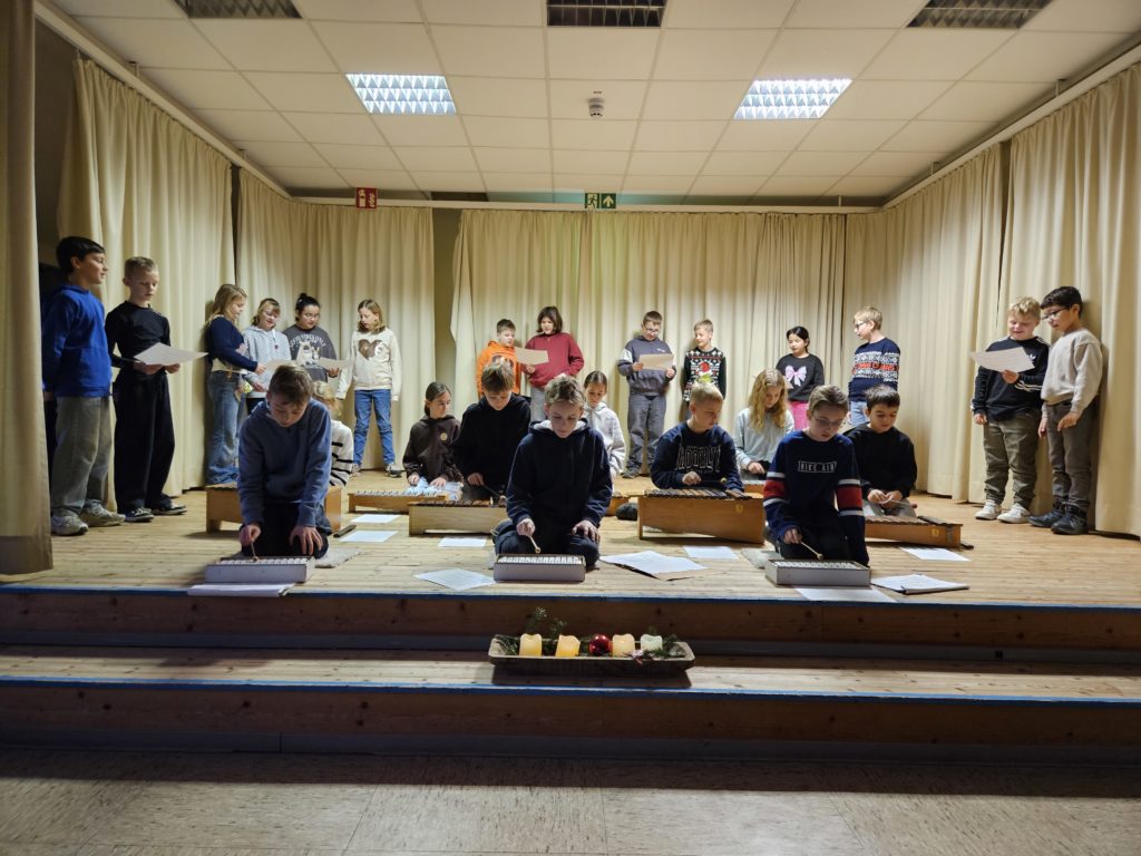 Am Montag, den 15.12.2025 fand das dritte und letzte Adventssingen des Jahres statt. In der ersten Stunde versammelten sich wieder alle Kinder und ihre Lehrkräfte in der Aula. Zuerst wurden drei Kerzen am Adventskranz zum Leuchten gebracht. Danach sangen alle gemeinsam die dritte Strophe des Liedes „Das Licht einer Kerze“. Anschließend waren die Kinder der 4. Klassen dran, etwas auf der Bühne zu präsentieren. Sie sangen das Lied „Heute leuchten alle Sterne“ und begleiteten es auf Xylophonen und Glockenspielen. Zum Abschluss ertönte wieder von allen das Lied „In der Weihnachtsbäckerei“, das von Frau Goer auf dem Klavier begleitet wurde.