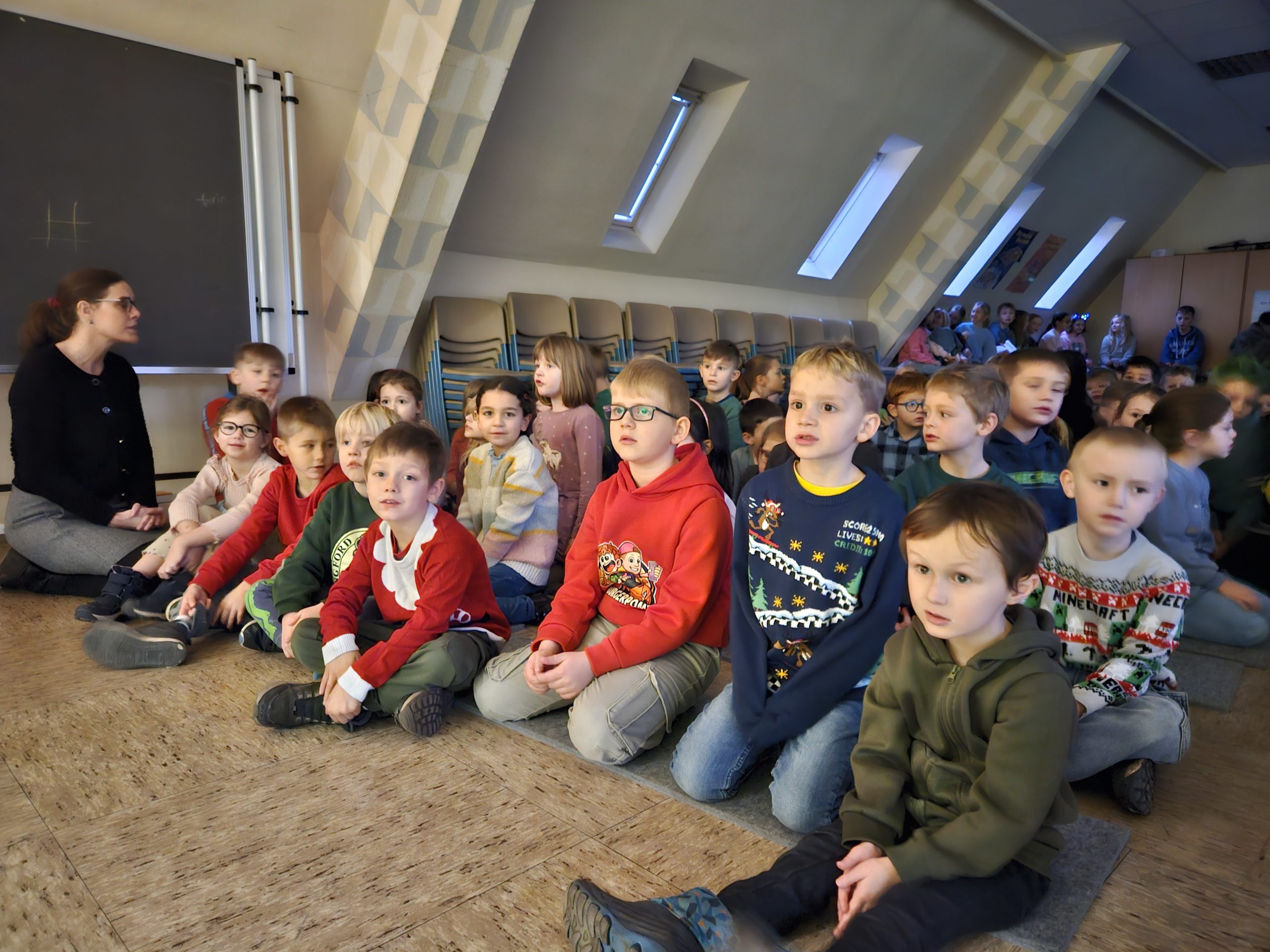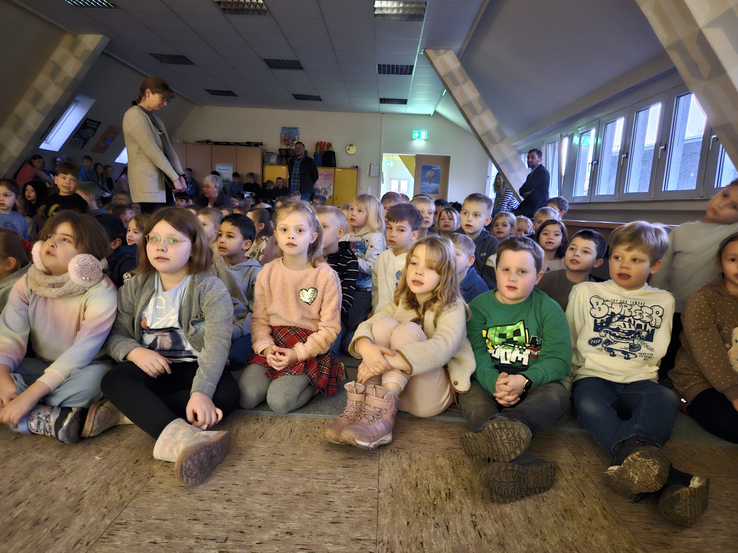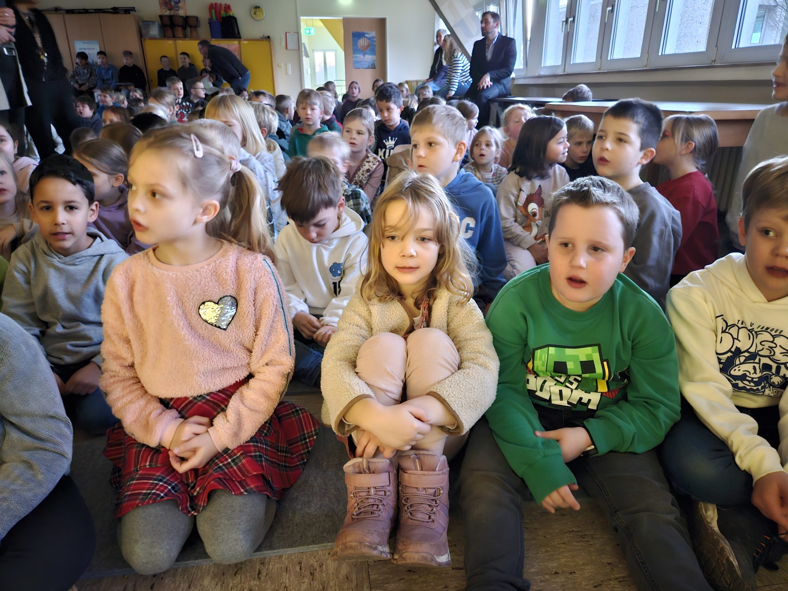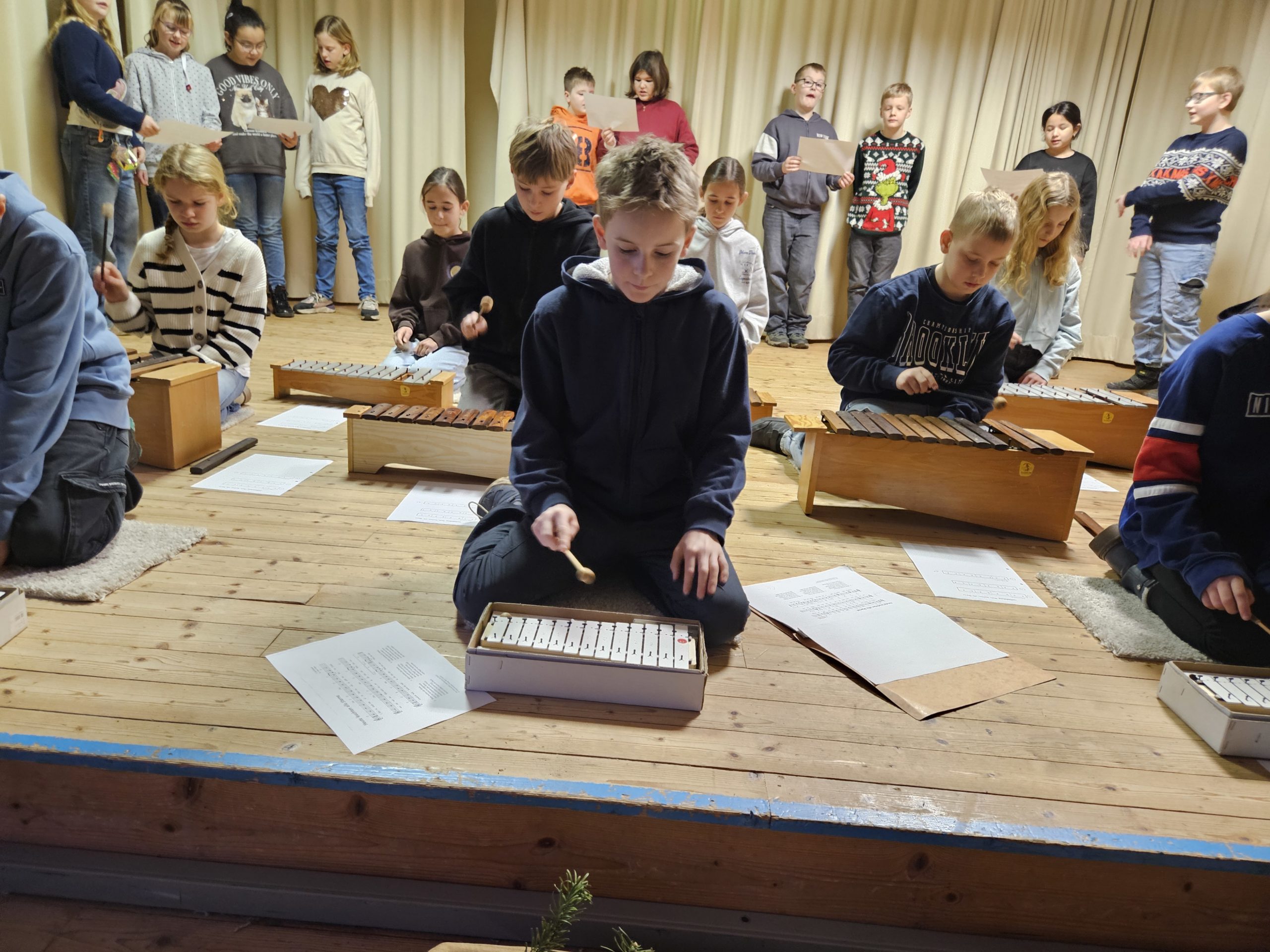 Am Montag, den 15.12.2025 fand das dritte und letzte Adventssingen des Jahres statt. In der ersten Stunde versammelten sich wieder alle Kinder und ihre Lehrkräfte in der Aula. Zuerst wurden drei Kerzen am Adventskranz zum Leuchten gebracht. Danach sangen alle gemeinsam die dritte Strophe des Liedes „Das Licht einer Kerze“. Anschließend waren die Kinder der 4. Klassen dran, etwas auf der Bühne zu präsentieren. Sie sangen das Lied „Heute leuchten alle Sterne“ und begleiteten es auf Xylophonen und Glockenspielen. Zum Abschluss ertönte wieder von allen das Lied „In der Weihnachtsbäckerei“, das von Frau Goer auf dem Klavier begleitet wurde.