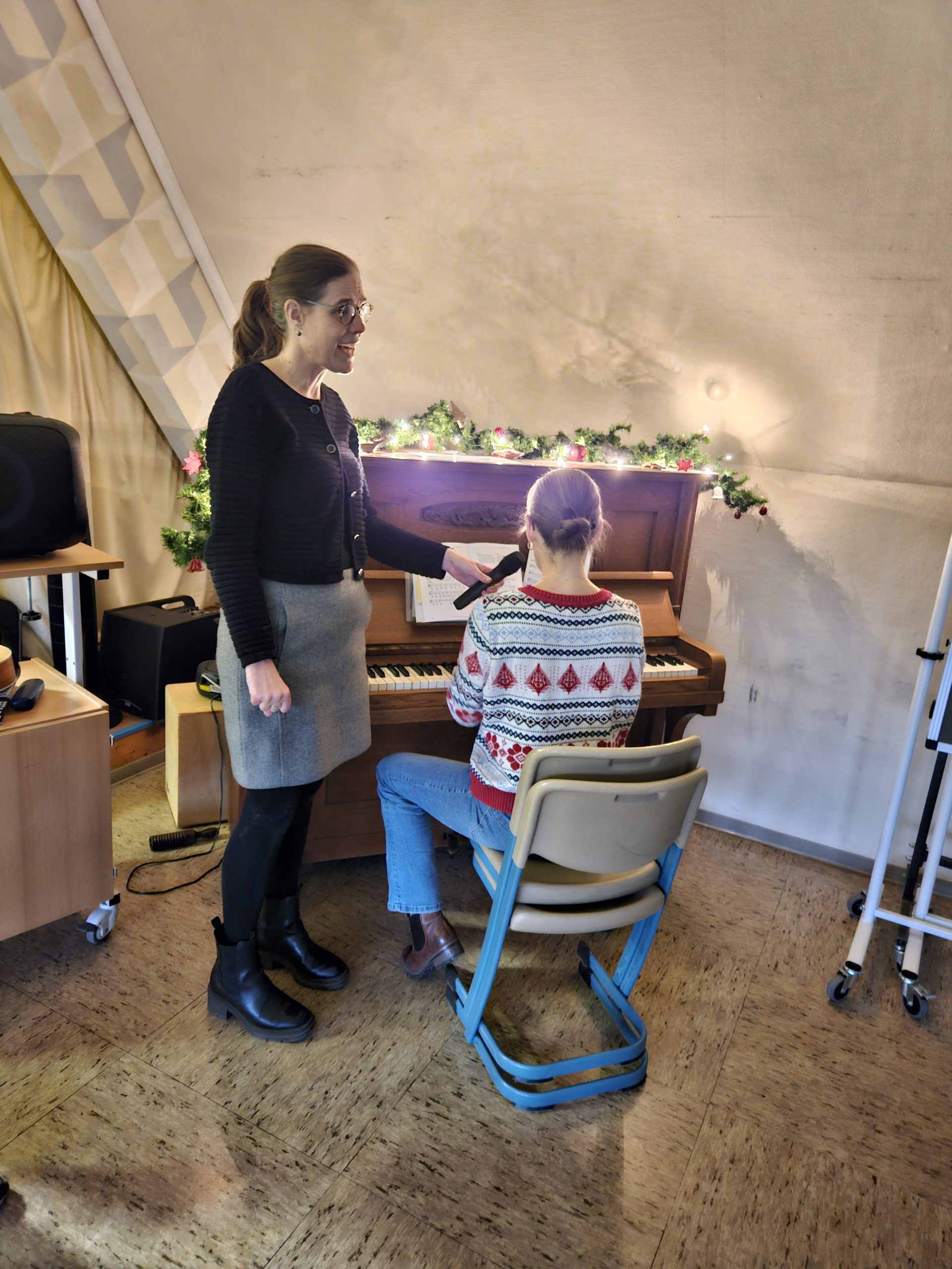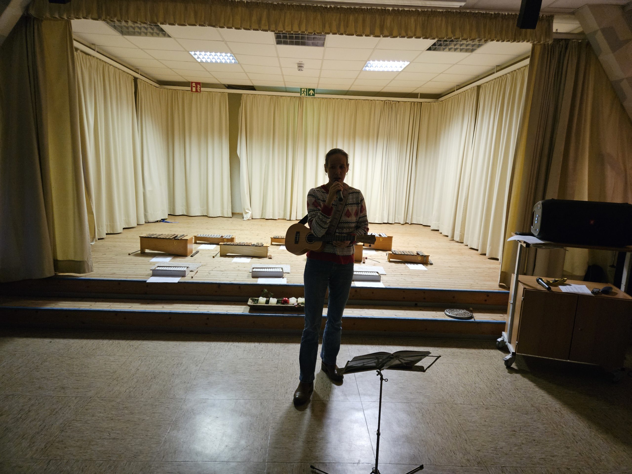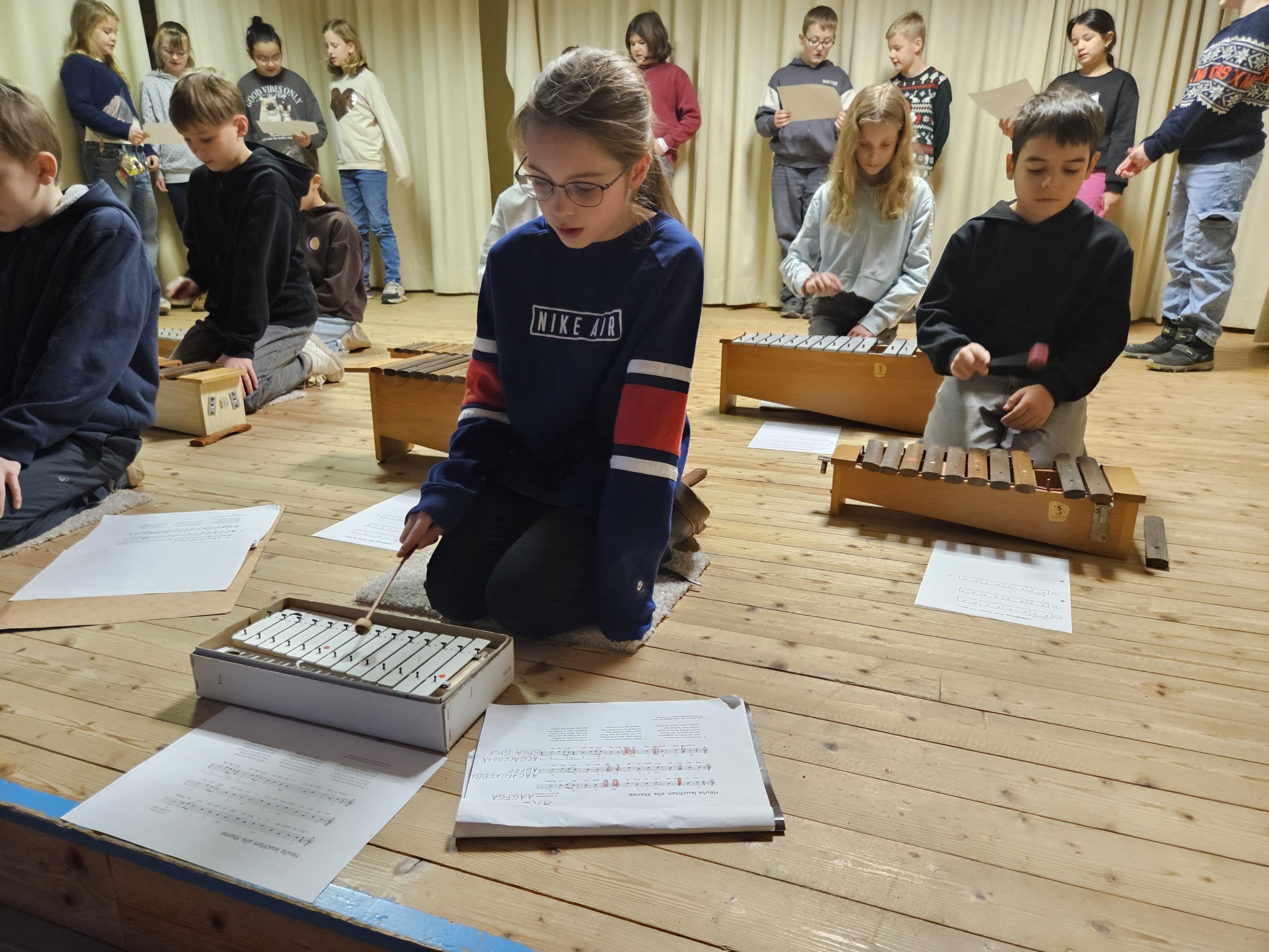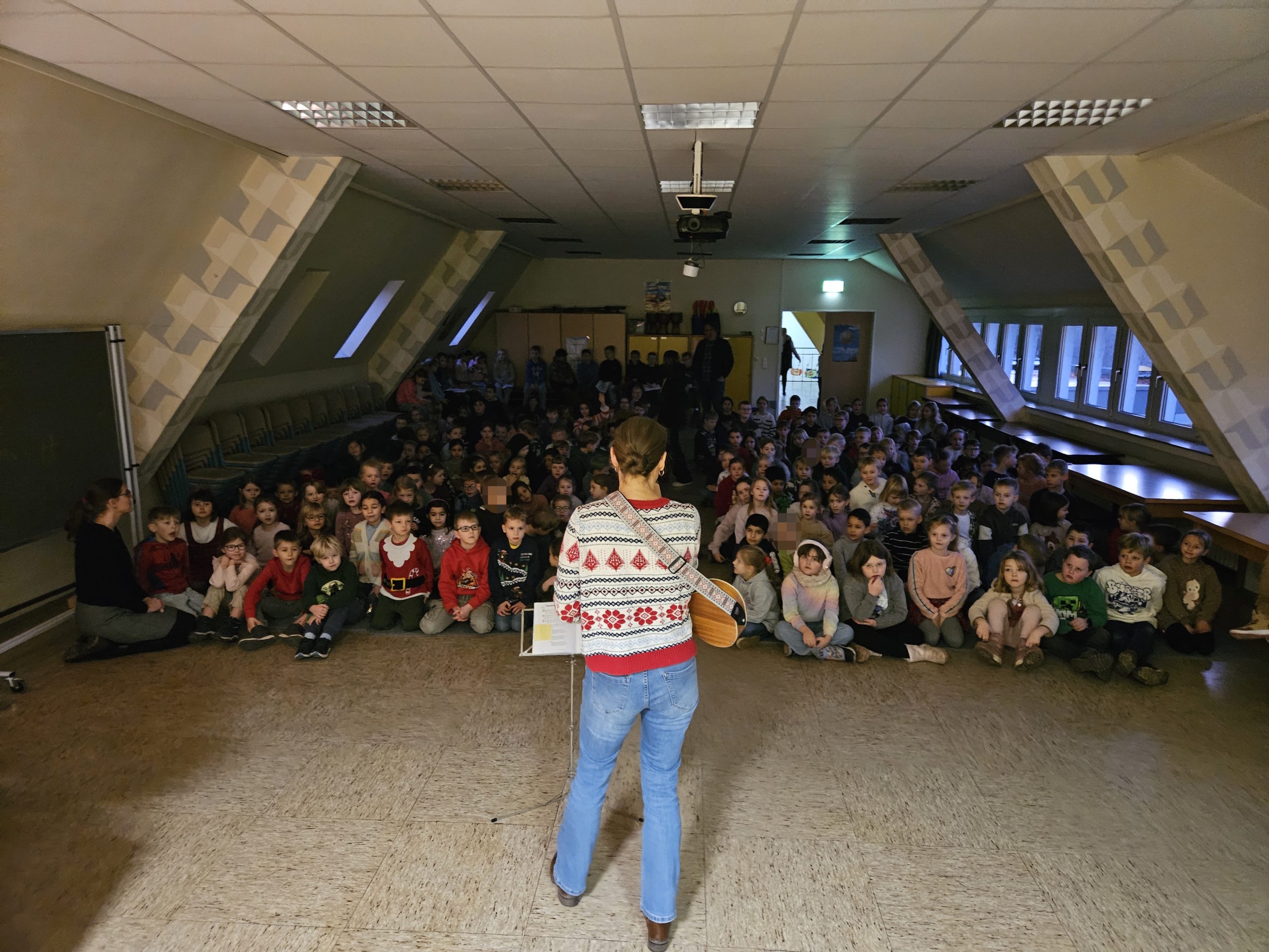 Am Montag, den 15.12.2025 fand das dritte und letzte Adventssingen des Jahres statt. In der ersten Stunde versammelten sich wieder alle Kinder und ihre Lehrkräfte in der Aula. Zuerst wurden drei Kerzen am Adventskranz zum Leuchten gebracht. Danach sangen alle gemeinsam die dritte Strophe des Liedes „Das Licht einer Kerze“. Anschließend waren die Kinder der 4. Klassen dran, etwas auf der Bühne zu präsentieren. Sie sangen das Lied „Heute leuchten alle Sterne“ und begleiteten es auf Xylophonen und Glockenspielen. Zum Abschluss ertönte wieder von allen das Lied „In der Weihnachtsbäckerei“, das von Frau Goer auf dem Klavier begleitet wurde.